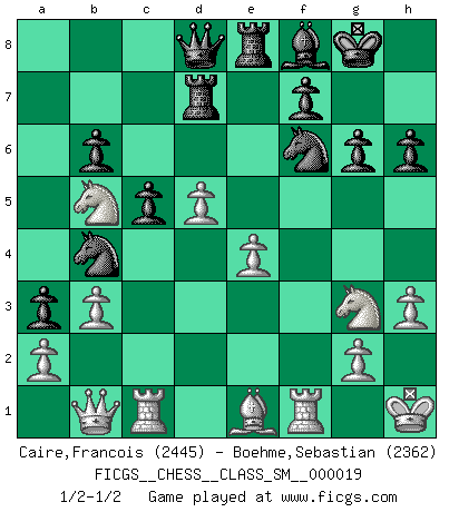 Last move : 1/2-1/2 2015 June 3 1:48:6 [Event "FICGS__CHESS__CLASS_SM__000019"] [Site "FICGS"] [Date "2014.10.27"] [Round "1"] [White "Caire,Francois"] [Black "Boehme,Sebastian"] [Result "1/2-1/2"] [WhiteElo "2445"] [BlackElo "2362"] 1.d4 Nf6 2.c4 e6 3.Nc3 d5 4.cxd5 exd5 5.Bg5 c6 6.Qc2 h6 7.Bh4 Bd6 8.e3 O-O 9.Bd3 Re8 10.Nge2 a5 11.h3 b6 12.O-O Ba6 13.Rac1 Bxd3 14.Qxd3 a4 15.f3 a3 16.b3 Be7 17.Bf2 Na6 18.e4 Nb4 19.Qb1 dxe4 20.fxe4 Ra7 21.Kh1 c5 22.d5 Rd7 23.Ng3 Bf8 24.Be1 g6 25.Nb5 1/2-1/2 Queen's pawn game Kingside Castling by player Black (move 8) Kingside Castling by player White (move 12) This chess game ended in a draw. Follow this game move after move (download)Life is like a game of Chess, changing with each move. (Chinese proverb) Ich liebe den Moment, wenn ich das Ego meines Gegenüber breche. (Robert James Fischer) El Ajedrez es de 30 a 40 por ciento psicología. Uno no cuenta con esto cuando se juega contra una computadora. No lo puedo confundir. (Judith Polgar) Que feriez-vous si vous étiez en train de jouer aux échecs et que la fin du monde arrive ? Je continuerais à jouer. (Saint Borromée) He who laughs last probably does not get the joke. (Unknown)