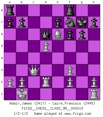 Last move : 1/2-1/2 2015 March 2 2:11:56 [Event "FICGS__CHESS__CLASS_SM__000019"] [Site "FICGS"] [Date "2014.10.27"] [Round "1"] [White "Adair,James"] [Black "Caire,Francois"] [Result "1/2-1/2"] [WhiteElo "2417"] [BlackElo "2445"] 1.d4 Nf6 2.c4 g6 3.Nc3 d5 4.cxd5 Nxd5 5.Bd2 Bg7 6.e4 Nxc3 7.Bxc3 O-O 8.Qd2 Nc6 9.Nf3 Bg4 10.d5 Bxf3 11.Bxg7 Kxg7 12.gxf3 Ne5 13.O-O-O c6 14.Qc3 f6 15.Bh3 Qb6 16.Rd2 Nf7 17.Kb1 cxd5 18.exd5 Qd6 19.Be6 1/2-1/2 King's Indian defense, 3.Nc3 Kingside Castling by player Black (move 7) Queenside Castling by player White (move 13) This chess game ended in a draw. Follow this game move after move (download)Chess is a beautiful mistress. (Bent Larsen) Strategie ist, wie man ein Mädchen auf den Rücksitz bekommt. Taktik ist, was man tut, wenn man dann dort ist. (Anonymous) Una de estas pequeñas movidas modestas pudieran ser mas molestas a tu oponente que la amenaza mas grande. (Siegbert Tarrasch) Les ravages du H expliquent la différence de niveau entre Tal et Thal [Abergel]. Wisdom is the reward you get for a lifetime of listening when you'd have preferred to talk. (Doug Larson)