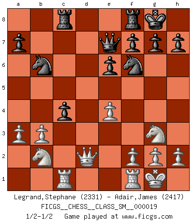 Last move : 1/2-1/2 2015 May 1 8:41:45 [Event "FICGS__CHESS__CLASS_SM__000019"] [Site "FICGS"] [Date "2014.10.27"] [Round "1"] [White "Legrand,Stephane"] [Black "Adair,James"] [Result "1/2-1/2"] [WhiteElo "2331"] [BlackElo "2417"] 1.d4 Nf6 2.c4 e6 3.Nc3 Bb4 4.e3 b6 5.Nge2 c5 6.a3 Ba5 7.Rb1 Na6 8.Bd2 O-O 9.Ng3 d5 10.dxc5 bxc5 11.Bd3 Nc7 12.Qc2 Ba6 13.b3 Nce8 14.cxd5 Bxd3 15.Qxd3 Nxd5 16.Na4 Bxd2+ 17.Qxd2 Qe7 18.O-O Nb6 19.Nb2 Rc8 20.Rbc1 Nf6 21.e4 c4 1/2-1/2 Nimzo-Indian : Fischer variation Kingside Castling by player Black (move 8) Kingside Castling by player White (move 18) This chess game ended in a draw. Follow this game move after move (download)A bad day of Chess is better than any good day at work. (Anonymous) Frage des Reporters: -Worin besteht das Ziel von Gambiteröffnungen? Antwort: -Auf Kosten der Partie einen Ruf als Angriffspieler zu erwerben.- (Siegbert Tarrasch) Prefiero perder una partida realmente buena, que ganar una mala. (David Levy) Les échecs sont utiles à l'exercice de la faculté de penser et à celle de l'imagination. Car nous devons posséder une méthode élaborée pour atteindre des buts partout où nous devons conduire notre raison. (Leibnitz) The next best thing to gambling and winning is gambling and loosing. (Nick Dandalos)