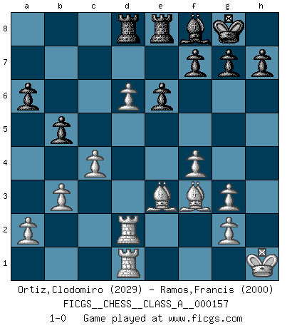 Last move : 1-0 2014 December 13 14:58:32 [Event "FICGS__CHESS__CLASS_A__000157"] [Site "FICGS"] [Date "2014.10.29"] [Round "1"] [White "Ortiz,Clodomiro"] [Black "Ramos,Francis"] [Result "1-0"] [WhiteElo "2029"] [BlackElo "2000"] 1.e4 c5 2.Nf3 d6 3.d4 cxd4 4.Qxd4 a6 5.Bc4 e6 6.Be2 Nc6 7.Qe3 Nf6 8.c4 Be7 9.O-O O-O 10.Nc3 Qc7 11.b3 Re8 12.Rd1 Bf8 13.Bb2 Bd7 14.Rd2 Ne5 15.Rad1 Bc6 16.Nd4 Rad8 17.Nxc6 Qxc6 18.Kh1 b6 19.f4 Neg4 20.Qg3 Nh6 21.e5 Ne4 22.Nxe4 Qxe4 23.Bf3 Qe3 24.Bd4 Nf5 25.Bxe3 Nxg3+ 26.hxg3 b5 27.exd6 1-0 Sicilian, Chekhover variation Kingside Castling by player White (move 9) Kingside Castling by player Black (move 9) Player White won this chess game. Follow this game move after move (download)A bad plan is better than none at all. (Frank Marshall) Gegen einen Schachcomputer zu verlieren ist wie Löcher in den Strümpfen zuhaben. Es ist nicht peinlich, solange man der einzige ist der es weiß. (Anonymous) Aquel que teme a un Peón de Reina aislado, debería de retirarse del Ajedrez. (Siegbert Tarrasch) 'L'échange des dames est un coup dur pour les deux adversaires...' Un journaliste lors d'une partie du match Spassky-Fischer It's not the size of the dog in the fight, it's the size of the fight in the dog. (Mark Twain)