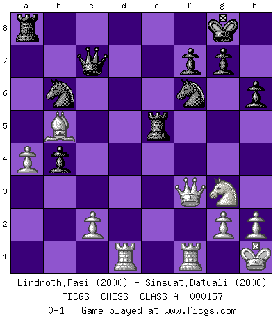 Last move : 0-1 2015 May 3 9:9:38 [Event "FICGS__CHESS__CLASS_A__000157"] [Site "FICGS"] [Date "2014.10.29"] [Round "1"] [White "Lindroth,Pasi"] [Black "Sinsuat,Datuali"] [Result "0-1"] [WhiteElo "2000"] [BlackElo "2000"] 1.e4 c5 2.Nf3 d6 3.d4 cxd4 4.Nxd4 Nf6 5.Nc3 a6 6.Be2 e5 7.Nb3 Be6 8.f4 Be7 9.O-O O-O 10.Kh1 b5 11.Be3 Re8 12.a4 b4 13.Nd5 Bxd5 14.exd5 Nbd7 15.fxe5 dxe5 16.d6 Bf8 17.Bc4 e4 18.Bg5 h6 19.Bh4 Qc8 20.Qe2 Bxd6 21.Nd4 Be5 22.Nf5 Qc7 23.Bxa6 Bxb2 24.Rad1 e3 25.Bb5 Re6 26.Bg3 Be5 27.Qxe3 Bxg3 28.Qf3 Nb6 29.Nxg3 Re5 0-1 This chess game has been lost on time (started : 2014.10.29 9:23:18) Sicilian : Najdorf, Opovcensky variation Kingside Castling by player White (move 9) Kingside Castling by player Black (move 9) Player Black won this chess game. Follow this game move after move (download)The passed pawn is a criminal, who should be kept under lock and key. Mild measures, such as police surveillance, are not sufficient. (Nimzovitch) Ich glaube, ich kenne inzwischen die Gründe für mein Versagen: schachliche Charakterfehler. Ich war nie ein Wunderkind und in meiner gesamten menschlichen Entwicklung immer zu langsam. (Viktor Kortschnoi) Creo que una cierta cantidad de temperamento es esperada de los genios del Ajedrez. (Ron Gross) Karpov est une pièce de musée. (Garry Kasparov) Heh, heh, heh. Time to abandon ship. (General Grievous in Star Wars ep.3)