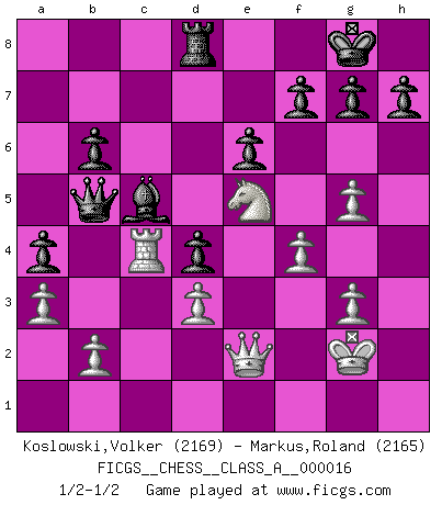 Last move : 1/2-1/2 2007 May 21 20:21:49 [Event "FICGS__CHESS__CLASS_A__000016"] [Site "FICGS"] [Date "2007.02.23"] [Round "1"] [White "Koslowski,Volker"] [Black "Markus,Roland"] [Result "1/2-1/2"] [WhiteElo "2169"] [BlackElo "2165"] 1.e4 c6 2.f4 d5 3.Nf3 dxe4 4.Ng5 Nf6 5.Nc3 Bf5 6.d3 exd3 7.Bxd3 Bxd3 8.cxd3 e6 9.Be3 Be7 10.O-O Na6 11.a3 O-O 12.Nf3 Ng4 13.Re1 Nc7 14.Rc1 Nd5 15.Nxd5 Qxd5 16.Bd4 c5 17.h3 cxd4 18.hxg4 Bd6 19.g3 Rac8 20.Kf2 Rxc1 21.Qxc1 Rd8 22.g5 Qb5 23.Qc2 a5 24.Kg2 Bc5 25.Rc1 b6 26.Ne5 a4 27.Qe2 Re8 28.Rc4 Rd8 29.Kh3 Qe8 30.Kg2 Qb5 1/2-1/2 Caro-Kann defense Kingside Castling by player White (move 10) Kingside Castling by player Black (move 11) This chess game ended in a draw. Follow this game move after move (download)In complicated positions, Bobby Fischer hardly had to be afraid of anybody. (Paul Keres) Fischer ist das größte Genie, das je vom Schachhimmel heruntergestiegen ist. (Mikhail Nekhemyevich Tal) ¿Quién es tu oponente esta tarde? Esta tarde mi oponente son las piezas negras. (Akiba Rubinstein) Aux échecs, les retours au sommet sont rares : les dommages psychologiques consécutifs à une défaite sont trop sévères. (Daily Telegraph) All politicians must be presumed guilty until they are proven innocent. (Dinesh De Silva)
