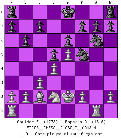 Last move : 1-0 2015 April 16 18:45:29 [Event "FICGS__CHESS__CLASS_C__000214"] [Site "FICGS"] [Date "2014.10.29"] [Round "1"] [White "Gouldar,Frances"] [Black "Ropokis,Dimitrios"] [Result "1-0"] [WhiteElo "1772"] [BlackElo "1616"] 1.e4 b6 2.Nf3 Bb7 3.Bc4 e6 4.e5 Bxf3 5.Qxf3 Nc6 6.Qf4 Nge7 7.d4 Ng6 8.Qe4 Qh4 9.Qxh4 Nxh4 10.c3 Nxg2+ 11.Ke2 Be7 12.Rg1 Nh4 13.Bg5 Nf5 14.Bxe7 Ncxe7 15.Nd2 d5 16.Bb3 Ng6 17.Bc2 1-0 This chess game has been lost on time (started : 2014.10.29 17:8:13) Owen defense Player White won this chess game. Follow this game move after move (download)Becoming successful at Chess allows you to discover your own personality. That's what I want for the kids I teach. (Saudin Robovic) Die unerbitterlichsten Regeln im Schach sind die Ausnahmen. (Savielly Grigorievitsch Tartakower) El Ajedrez es 99 por ciento táctica. (Teichmann) Il vaut toujours mieux jouer un plan faux de façon logique que de n'avoir pas de plan du tout. (Victor Kortchnoï) Those parts of the system that you can hit with a hammer (not advised) are called hardware; those program instructions that you can only curse at are called software. (Anonymous)