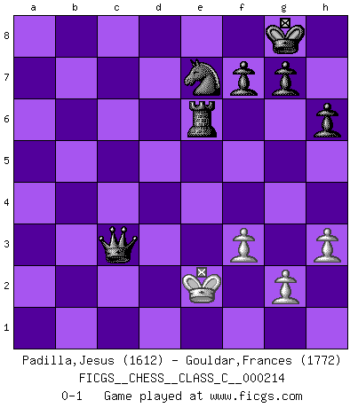 Last move : 0-1 2015 November 30 19:54:7 [Event "FICGS__CHESS__CLASS_C__000214"] [Site "FICGS"] [Date "2014.10.29"] [Round "1"] [White "Padilla,Jesus"] [Black "Gouldar,Frances"] [Result "0-1"] [WhiteElo "1612"] [BlackElo "1772"] 1.e4 e5 2.Nf3 Nc6 3.Bb5 d6 4.Nc3 Bd7 5.O-O Nf6 6.Re1 a6 7.Ba4 Be7 8.d3 O-O 9.h3 b5 10.Bb3 Na5 11.a3 Nxb3 12.cxb3 c5 13.b4 cxb4 14.axb4 Bc6 15.Qb3 Qb6 16.Bg5 h6 17.Be3 Qb7 18.d4 exd4 19.Nxd4 Bxe4 20.f3 Bd5 21.Nxd5 Nxd5 22.Bf2 Rfe8 23.Rac1 Bg5 24.Rc6 Rxe1+ 25.Bxe1 Ne7 26.Rxd6 Bf4 27.Nf5 Bxd6 28.Nxd6 Qb6+ 29.Bf2 Qxd6 30.Qe3 Rd8 31.Qc5 Qxc5 32.bxc5 Rd1+ 33.Kh2 Rd2 34.Be3 Rxb2 35.Bd4 Rc2 36.Be3 b4 37.Kg1 b3 38.Bd4 b2 39.Bxb2 Rxb2 40.Kf1 Rc2 41.c6 Rxc6 42.Kf2 a5 43.Ke3 a4 44.Kd4 a3 45.Ke5 a2 46.Kd4 a1Q+ 47.Kd3 Qc3+ 48.Ke2 Re6+ 0-1 This chess game has been lost on time (started : 2014.10.29 17:8:13) Ruy Lopez : Old Steinitz defense Kingside Castling by player White (move 5) Kingside Castling by player Black (move 8) Promotion Queen by player Black (move 46) Player Black won this chess game. Follow this game move after move (download)Fischer was a master of clarity and a king of artful positioning. His opponents would see where he was going but were powerless to stop him. (Bruce Pandolfini) Wir irren allesamt, nur jeder irrt anders. (Georg Christoph Lichtenberg) Después de la respuesta de las negras a 1.e4 con 1..e5, se quedan siempre tratando de entrar dentro del juego. (Howard Staunton) Votre prénom est 'Tactique', votre deuxième prénom est 'Tactique' et votre nom est 'Tactique'. (Ken Smith) Don't be discouraged. It's often the last key in the bunch that opens the lock. (Author unknown)
