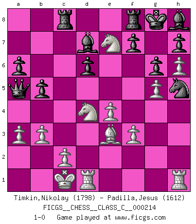 Last move : 1-0 2015 January 31 8:35:28 [Event "FICGS__CHESS__CLASS_C__000214"] [Site "FICGS"] [Date "2014.10.29"] [Round "1"] [White "Timkin,Nikolay"] [Black "Padilla,Jesus"] [Result "1-0"] [WhiteElo "1798"] [BlackElo "1612"] 1.e4 c5 2.Nf3 d6 3.d4 cxd4 4.Nxd4 Nf6 5.Nc3 g6 6.Be3 Bg7 7.f3 O-O 8.Qd2 Nc6 9.Bc4 Bd7 10.Bb3 Rc8 11.h4 Ne5 12.O-O-O Nc4 13.Bxc4 Rxc4 14.g4 a6 15.h5 b5 16.h6 Bh8 17.a3 Qc7 18.g5 Nh5 19.Nd5 Qd8 20.b3 Rc8 21.Qa5 Qxa5 22.Nxe7+ 1-0 Sicilian : Dragon, Yugoslav attack, 7...O-O Kingside Castling by player Black (move 7) Queenside Castling by player White (move 12) Player White won this chess game. Follow this game move after move (download)It's always better to sacrifice your opponent's men. (Savielly Tartakover) Auf Remis zu spielen ist gewissermaßen ein Verbrechen gegen das Schachspiel. (Mikhail Nekhemyevich Tal) a manera como él juega al Ajedrez, demuestra la completa naturaleza de un hombre. (Stanley Ellin) Horreur, mais aussi harmonie suprême : qu'y avait-il en effet au monde en dehors des échecs ? Le brouillard, l'inconnu, le non-être... (Vladimir Nabokov) The arrogant army will lose certainly the battle. (Chinese proverb)