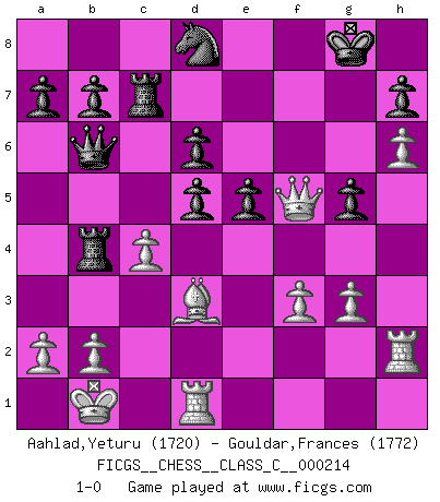 Last move : 1-0 2015 July 15 10:23:7 [Event "FICGS__CHESS__CLASS_C__000214"] [Site "FICGS"] [Date "2014.10.29"] [Round "1"] [White "Aahlad,Yeturu"] [Black "Gouldar,Frances"] [Result "1-0"] [WhiteElo "1720"] [BlackElo "1772"] 1.e4 c5 2.Nf3 d6 3.d4 cxd4 4.Nxd4 Nf6 5.Nc3 g6 6.Be3 Bg7 7.f3 O-O 8.Qd2 Nc6 9.O-O-O Be6 10.Nxe6 fxe6 11.Kb1 Rc8 12.Ne2 Qc7 13.Nf4 Nd8 14.h4 Bh6 15.Bd3 e5 16.Nd5 Bxe3 17.Qxe3 Nxd5 18.exd5 Qc5 19.Qe1 Rf4 20.h5 g5 21.g3 Rb4 22.c4 e6 23.Qe4 Rc7 24.h6 Qb6 25.Rh2 exd5 26.Qf5 1-0 Sicilian : Dragon, Yugoslav attack, 7...O-O Kingside Castling by player Black (move 7) Queenside Castling by player White (move 9) Player White won this chess game. Follow this game move after move (download)I love all positions. Give me a difficult positional game, I will play it. But totally won positions, I cannot stand them. (Hein Donner) Ich trinke, ich rauche, ich spiele, ich liebe Frauen aber Fernschach ist ein Laster, das ich nicht habe. (Mikhail Nekhemyevich Tal) El pensamiento metódico es mas útil en el Ajedrez que la inspiración. (C. J. S. Purdy) Aux échecs, les retours au sommet sont rares : les dommages psychologiques consécutifs à une défaite sont trop sévères. (Daily Telegraph) Work expands to fill the time available. (C. Northcote Parkinson, in Parkinson's Laws)