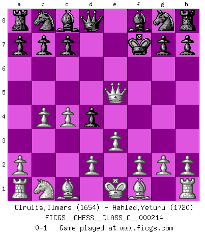 Last move : 0-1 2014 November 22 14:2:12 [Event "FICGS__CHESS__CLASS_C__000214"] [Site "FICGS"] [Date "2014.10.29"] [Round "1"] [White "Cirulis,Ilmars"] [Black "Aahlad,Yeturu"] [Result "0-1"] [WhiteElo "1654"] [BlackElo "1720"] 1.b4 d5 2.Nf3 f6 3.c4 d4 4.e3 e5 5.Nxe5 fxe5 6.Qh5+ Ke7 7.Qxe5+ Kf7 0-1 Polish (Sokolsky) opening Player Black won this chess game. Follow this game move after move (download)I have always a slight feeling of pity for the man who has no knowledge of Chess. (Siegbert Tarrasch) Das ganze Leben mit einer Ehefrau ist wie ein Endspiel mit ungleichfarbigen Läufern. (Viktor Kortschnoi) Todo se encuentra en un estado de flujo y esto incluye al mundo del Ajedrez. (Mikhail Botvinnik) Le système Elo représente seulement une moyenne. Il est simplement un indicateur de votre stabilité. (Anatoli Karpov) In every real man a child is hidden that wants to play. (Friedrich Nietzsche)