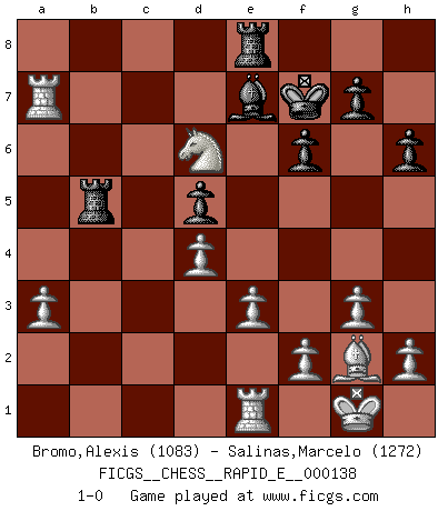 Last move : 1-0 2015 January 27 6:30:23 [Event "FICGS__CHESS__RAPID_E__000138"] [Site "FICGS"] [Date "2014.10.30"] [Round "1"] [White "Bromo,Alexis"] [Black "Salinas,Marcelo"] [Result "1-0"] [WhiteElo "1083"] [BlackElo "1272"] 1.d4 e6 2.a3 Nf6 3.c4 Ne4 4.Nc3 Qh4 5.g3 Nxc3 6.bxc3 Qe4 7.Nf3 c5 8.Bg2 cxd4 9.cxd4 Nc6 10.Bb2 h6 11.O-O Qg4 12.e3 d5 13.cxd5 exd5 14.Rc1 Qe6 15.Qa4 f6 16.Rfe1 b5 17.Qxb5 Rb8 18.Qxc6+ Qxc6 19.Rxc6 Rxb2 20.Rxc8+ Kf7 21.Rc7+ Be7 22.Rxa7 Rc8 23.Nh4 Rb5 24.Nf5 Re8 25.Nd6+ 1-0 This chess game has been lost on time (started : 2014.10.30 21:38:42) Queen's pawn Kingside Castling by player White (move 11) Player White won this chess game. Follow this game move after move (download)Chess is like life. (Boris Spassky) Das Zentrum ist der Balkan des Schachbretts - Kriegshandlungen können in jedem Moment ausbrechen. (Aaron Nimzowitsch) Me siento como si fuera una pieza en una partida de Ajedrez, cuando mi oponente me indica: esa pieza no puede ser movida. (Soren Kierkegaard) Les échecs, c'est l'imagination. (David Bronstein) Political correctness is subjecting us to gross incompetence. (Johann Piek)
