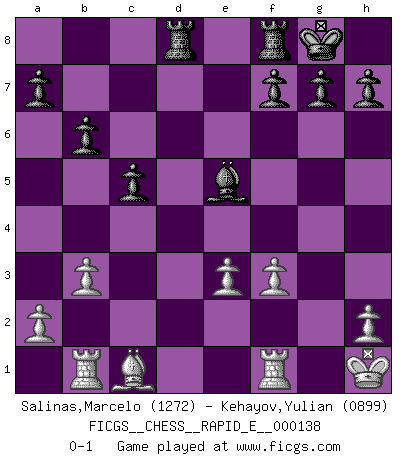 Last move : 0-1 2015 January 8 0:53:57 [Event "FICGS__CHESS__RAPID_E__000138"] [Site "FICGS"] [Date "2014.10.30"] [Round "1"] [White "Salinas,Marcelo"] [Black "Kehayov,Yulian"] [Result "0-1"] [WhiteElo "1272"] [BlackElo "0899"] 1.Nc3 e5 2.Ne4 d5 3.Ng3 Nf6 4.e3 Be7 5.Nf3 e4 6.Ne5 O-O 7.d3 Nbd7 8.d4 Bd6 9.c4 Nxe5 10.dxe5 Bxe5 11.Nh5 Nxh5 12.Qxh5 Qf6 13.Rb1 dxc4 14.Bxc4 Be6 15.Bxe6 Qxe6 16.b3 Rad8 17.O-O c5 18.f4 exf3 19.Qxf3 Qf6 20.Kh1 Qxf3 21.gxf3 b6 0-1 Dunst (Sleipner-Heinrichsen) Opening Kingside Castling by player Black (move 6) Kingside Castling by player White (move 17) Player Black won this chess game. Follow this game move after move (download)Chess is war over the board. The object is to crush the opponents mind. (Bobby Fischer) Ohne Leiden bildet sich kein Charakter. (Ernst Freiherr von Feuchtersleben) Yo siempre he tenido un ligero sentimiento de lástima por una persona que no tiene conocimiento del Ajedrez. (Siegbert Tarrasch) Je crois qu'il existe des manières très spécifiques de jouer efficacement contre une machine. Evidemment, nous n'avons aucune chance en technique pure, parce que l'ordinateur calcule de manière parfaite. Mais lorsque nous faisons appel à notre cerveau, en utilisant l'intuition et la compréhension, alors nous restons beaucoup plus forts. (Anatoli Karpov) CHESS, n. f. [echecs, Fr.] A nice and abstruse game, in which two sets of puppets are moved in opposition to each other. (Dr Samuel Johnson, A Dictionary Of The English Language, 1755)
