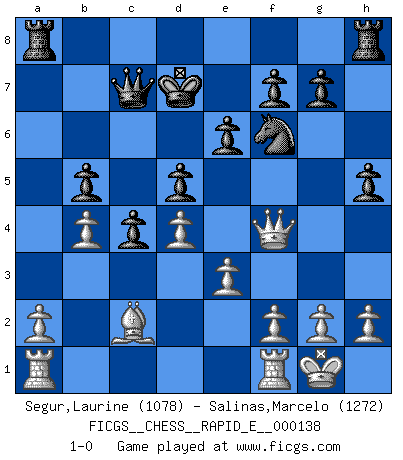Last move : 1-0 2015 February 9 19:47:18 [Event "FICGS__CHESS__RAPID_E__000138"] [Site "FICGS"] [Date "2014.10.30"] [Round "1"] [White "Segur,Laurine"] [Black "Salinas,Marcelo"] [Result "1-0"] [WhiteElo "1078"] [BlackElo "1272"] 1.d4 e6 2.e3 Bb4+ 3.Bd2 Bxd2+ 4.Nxd2 Qe7 5.Bd3 Qg5 6.Ngf3 Qa5 7.Ne5 d5 8.c3 c5 9.O-O c4 10.Bc2 Nd7 11.Nxd7 Bxd7 12.b3 b5 13.Nf3 Nf6 14.b4 Qc7 15.Ne5 a5 16.Nxd7 Kxd7 17.Qf3 h5 18.Qf4 axb4 19.cxb4 1-0 This chess game has been lost on time (started : 2014.10.30 21:38:42) Queen's pawn Kingside Castling by player White (move 9) Player White won this chess game. Follow this game move after move (download)It is difficult to play against Einstein's theory --on his first loss to Fischer. (Mikhail Tal) Der Schachmeister von Heute braucht Courage, einen Killerinstinkt, Ausdauer und Arroganz. (Larry Evans) Ciertamente, de todas la drogas del mundo, el Ajedrez debe ser el mas placentero permamentemente. (Assiac) Les Echecs ne sont pas pour les âmes timides. Ils requièrent un homme entier, qui ne s'arrête pas aveuglément à ce qui a été déjà établi, mais qui tente individuellement de sonder les profondeurs du jeu. (W. Steinitz) A shortcut is the longest distance between two points. (Don Groves)