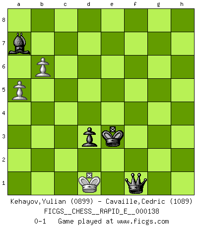 Last move : 0-1 2014 November 5 20:33:24 [Event "FICGS__CHESS__RAPID_E__000138"] [Site "FICGS"] [Date "2014.10.30"] [Round "1"] [White "Kehayov,Yulian"] [Black "Cavaille,Cedric"] [Result "0-1"] [WhiteElo "0899"] [BlackElo "1089"] 1.e4 c5 2.d4 d6 3.Nf3 cxd4 4.Nxd4 Nc6 5.Nxc6 bxc6 6.Be2 Nf6 7.Bf3 e6 8.O-O Be7 9.c4 O-O 10.Nc3 Bb7 11.b3 d5 12.exd5 cxd5 13.cxd5 Nxd5 14.Nxd5 Bxd5 15.Bxd5 Qxd5 16.Qxd5 exd5 17.Re1 Bf6 18.Rb1 Rfe8 19.Rxe8+ Rxe8 20.Bd2 Re2 21.Rd1 h5 22.Kf1 Re7 23.Re1 Rxe1+ 24.Bxe1 g5 25.g3 Kg7 26.Kg2 Kg6 27.h3 g4 28.hxg4 hxg4 29.f3 Kg5 30.Bd2+ Kf5 31.fxg4+ Kxg4 32.Be3 Be5 33.Kf2 d4 34.Bd2 Bxg3+ 35.Kg2 Bf4 36.Bb4 f5 37.Bc5 Be3 38.Bxa7 Kf4 39.Kf1 Ke4 40.Ke2 f4 41.a4 d3+ 42.Kd1 Bxa7 43.b4 Ke3 44.a5 f3 45.b5 f2 46.b6 f1Q+ 0-1 Sicilian : Smith-Morra gambit Kingside Castling by player White (move 8) Kingside Castling by player Black (move 9) 10 pieces endgame at move 31 : White KBPPP , Black KBPPP WHITE : King + 1 Bishop 3 Pawns BLACK : King + 1 Bishop 3 Pawns 9 pieces endgame at move 34 : White KBPP , Black KBPPP WHITE : King + 1 Bishop 2 Pawns BLACK : King + 1 Bishop 3 Pawns 8 pieces endgame at move 38 : White KBPP , Black KBPP WHITE : King + 1 Bishop 2 Pawns BLACK : King + 1 Bishop 2 Pawns 7 pieces endgame at move 42 : White KPP , Black KBPP WHITE : King + 2 Pawns BLACK : King + 1 Bishop 2 Pawns Promotion Queen by player Black (move 46) Player Black won this chess game. Follow this game move after move (download)Excellence at Chess is one mark of a scheming mind. (Sir Arthur Conan Doyle) Das Schachspiel hat wie die Liebe, die Musik, die Fähigkeit, den Menschen glücklich zu machen. Ich habe ein leises Gefühl des Bedauerns für jeden, der das Schachspiel nicht kennt, so wie ich jeden bedaure, der die Liebe nicht kennt. (Siegbert Tarrasch) El Ajedrez es una manera fabulosa para que los niños aprendan a autovalorarse y a autoestimarse. (Saudin Robovic) Tous ces prétendus hommes politiques sont les pions, les Cavaliers, les Tours ou les Fous d'une partie d'échecs qui se jouera tant qu'un hasard ne renversera pas l'échiquier. (Honoré de Balzac) I just play for fun. (Anna Kournikova)