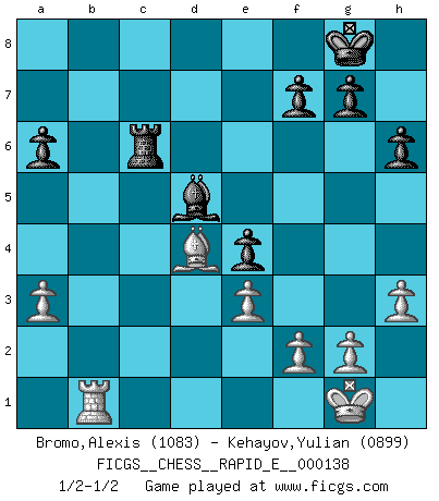 Last move : 1/2-1/2 2014 December 2 20:40:57 [Event "FICGS__CHESS__RAPID_E__000138"] [Site "FICGS"] [Date "2014.10.30"] [Round "1"] [White "Bromo,Alexis"] [Black "Kehayov,Yulian"] [Result "1/2-1/2"] [WhiteElo "1083"] [BlackElo "0899"] 1.d4 d5 2.c4 e6 3.a3 c5 4.Nc3 cxd4 5.Qxd4 Nf6 6.e3 Nc6 7.Qd2 Be7 8.Nf3 O-O 9.cxd5 exd5 10.Bb5 a6 11.Bxc6 bxc6 12.h3 h6 13.O-O Ne4 14.Nxe4 dxe4 15.Qxd8 Rxd8 16.b4 Bb7 17.Nd4 c5 18.bxc5 Bxc5 19.Bb2 Bxd4 20.Bxd4 Bd5 21.Rfc1 Rac8 22.Rxc8 Rxc8 23.Rb1 Rc6 1/2-1/2 Queen's gambit declined Kingside Castling by player Black (move 8) Kingside Castling by player White (move 13) This chess game ended in a draw. Follow this game move after move (download)Whoever sees no other aim in the game than that of giving checkmate to one's opponent will never become a good Chess player. (Euwe) Ich war schon mal beim Dopingtest. Da musste ich Urin abgeben, während Dritte zusahen. (Elisabeth Pähtz) El Ajedrez es una guerra en un tablero. El objetivo es aplastar la mente del oponente. (Bobby Fischer) La solitude du joueur d'Echecs à l'approche du mat est semblable à celle du condamné. (Francis Szpiner) A government big enough to give you everything you want is strong enough to take everything you have. (Thomas Jefferson)