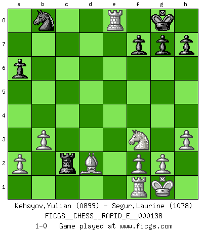 Last move : 1-0 2014 November 14 20:28:7 [Event "FICGS__CHESS__RAPID_E__000138"] [Site "FICGS"] [Date "2014.10.30"] [Round "1"] [White "Kehayov,Yulian"] [Black "Segur,Laurine"] [Result "1-0"] [WhiteElo "0899"] [BlackElo "1078"] 1.e4 c5 2.Nf3 e6 3.d4 d5 4.c4 b6 5.Be2 Bd6 6.Nc3 Nf6 7.e5 Bxe5 8.Nxe5 O-O 9.O-O a6 10.cxd5 exd5 11.dxc5 bxc5 12.h3 Qe8 13.Nf3 d4 14.Na4 Be6 15.Nxc5 Bd5 16.Qxd4 Qxe2 17.Bg5 Ne4 18.Qxd5 Ra7 19.b3 Rc8 20.Nd3 Rd7 21.Rae1 Qxd3 22.Qxd3 Rxd3 23.Rxe4 Rd2 24.Bxd2 Rc2 25.Re8+ 1-0 Sicilian : Marshall variation Kingside Castling by player Black (move 8) Kingside Castling by player White (move 9) Player White won this chess game. Follow this game move after move (download)We cannot resist the fascination of sacrifice, since a passion for sacrifices is part of a Chessplayer's nature. (Rudolf Spielman) Ich tröste mich mit dem Vergnügen, daß Schachfans, Zuschauer und Leser glücklich sind, wenn ein Großmeister etwas riskiert, statt nur Klötzchen zu schieben. (Mikhail Nekhemyevich Tal) Solo puedes ser bueno en el Ajedrez si amas al juego. (Bobby Fischer) Il n'y a pas de prix trop élevé au scalp de l'ennemi. (Koblentz) All art requires courage. (Anne Tucker)