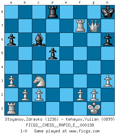 Last move : 1-0 2014 November 16 21:58:58 [Event "FICGS__CHESS__RAPID_E__000138"] [Site "FICGS"] [Date "2014.10.30"] [Round "1"] [White "Stoyanov,Zdravko"] [Black "Kehayov,Yulian"] [Result "1-0"] [WhiteElo "1236"] [BlackElo "0899"] 1.e4 e5 2.Nf3 d6 3.h3 Nf6 4.d3 Be7 5.Be2 O-O 6.O-O c6 7.a3 h6 8.Be3 d5 9.exd5 cxd5 10.d4 exd4 11.Bxd4 Nc6 12.Bb5 a6 13.Bxc6 bxc6 14.Ne5 Nd7 15.Nxc6 Qe8 16.Re1 Bb7 17.Nxe7+ Kh7 18.Nc3 Qc8 19.Nxc8 Raxc8 20.Re7 Rfe8 21.Rxd7 Bc6 22.Rxf7 Rg8 23.Qd3+ Kh8 24.Qg6 Rcd8 25.Bxg7+ Rxg7 26.Qxg7+ 1-0 Philidor's defense Kingside Castling by player Black (move 5) Kingside Castling by player White (move 6) Player White won this chess game. Follow this game move after move (download)The laws of Chess do not permit a free choice: you have to move whether you like it or not. (Emanuel Lasker) Die Partien sind immer verschieden, die Interviews immer die gleichen. (Garry Kasparov) Me siento como si fuera una pieza en una partida de Ajedrez, cuando mi oponente me indica: esa pieza no puede ser movida. (Soren Kierkegaard) Ce qui caractérise les parties de combat, c'est que si le défenseur a constamment de difficiles problèmes à résoudre, l'attaquant doit chercher sans relâche de nouvelles possibilités d'attaque. (Koblentz) Waiting for chance ? Play in casinos. (FICGS proverb)
