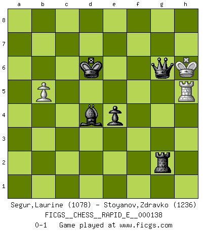 Last move : 0-1 2015 January 22 21:9:8 [Event "FICGS__CHESS__RAPID_E__000138"] [Site "FICGS"] [Date "2014.10.30"] [Round "1"] [White "Segur,Laurine"] [Black "Stoyanov,Zdravko"] [Result "0-1"] [WhiteElo "1078"] [BlackElo "1236"] 1.c4 c5 2.e3 Nc6 3.Bd3 a6 4.Nc3 d6 5.Nf3 Bg4 6.Ne4 e5 7.Be2 h6 8.b3 Nf6 9.Nxf6+ Qxf6 10.Bb2 O-O-O 11.Bd3 Re8 12.O-O Bxf3 13.Qxf3 Qxf3 14.gxf3 Be7 15.f4 f6 16.Rfe1 g5 17.Bf5+ Kb8 18.d4 cxd4 19.exd4 exd4 20.Red1 Bd8 21.Bxd4 Nxd4 22.Rxd4 Kc7 23.Rd5 Kc6 24.Rad1 Bc7 25.a4 gxf4 26.b4 Re5 27.Bg6 Rg8 28.b5+ axb5 29.axb5+ Kd7 30.Rxe5 fxe5 31.c5 Rxg6+ 32.Kf1 b6 33.cxb6 Bxb6 34.h4 Rg4 35.Ke2 Rxh4 36.Kf3 h5 37.Rg1 Rh2 38.Rg7+ Kc8 39.Rg8+ Kd7 40.Rg7+ Ke6 41.Rg6+ Kf7 42.Rxd6 Rxf2+ 43.Ke4 Re2+ 44.Kf5 Bd4 45.Rd7+ Ke8 46.Rh7 f3 47.Kf6 f2 48.Rh8+ Kd7 49.Rh7+ Kd6 50.Rxh5 f1Q+ 51.Kg7 e4 52.Kg8 Rg2+ 53.Kh7 Qf7+ 54.Kh6 Qg6+ 0-1 English : Symmetrical variation Queenside Castling by player Black (move 10) Kingside Castling by player White (move 12) 10 pieces endgame at move 42 : White KRPP , Black KRBPPP WHITE : King + 1 Rook 2 Pawns BLACK : King + 1 Rook 1 Bishop 3 Pawns 9 pieces endgame at move 42 : White KRP , Black KRBPPP WHITE : King + 1 Rook 1 Pawn BLACK : King + 1 Rook 1 Bishop 3 Pawns 8 pieces endgame at move 50 : White KRP , Black KRBPP WHITE : King + 1 Rook 1 Pawn BLACK : King + 1 Rook 1 Bishop 2 Pawns Promotion Queen by player Black (move 50) Player Black won this chess game. Follow this game move after move (download)Chess is a sea in which a gnat may drink and an elephant may bathe. (Hindu proverb) Sicherlich können nur Meister einen Stil haben. Daß ein nicht-Meister auch nur ein einziges Mal in seinem Leben eine Partie folgerecht durchführte, habe ich niemals bemerkt. (Emanuel Lasker) Ciertamente, de todas la drogas del mundo, el Ajedrez debe ser el mas placentero permamentemente. (Assiac) Je ne crois pas en la psychologie, je crois aux bons coups. (Robert Fischer) I don't know, I don't care, and it doesn't make any difference. (Albert Einstein)