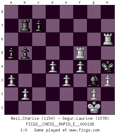Last move : 1-0 2015 January 24 19:34:26 [Event "FICGS__CHESS__RAPID_E__000138"] [Site "FICGS"] [Date "2014.10.30"] [Round "1"] [White "Neil,Charlie"] [Black "Segur,Laurine"] [Result "1-0"] [WhiteElo "1154"] [BlackElo "1078"] 1.d4 d5 2.Nf3 e6 3.c4 Bd6 4.Nc3 Nf6 5.Bg5 O-O 6.cxd5 exd5 7.Rc1 Re8 8.Nxd5 Nc6 9.e3 Be6 10.Bxf6 gxf6 11.Nc3 f5 12.Be2 Bd7 13.O-O Qf6 14.h3 a6 15.Re1 Nb4 16.a3 Nc6 17.Qb3 b5 18.Nd5 Qe6 19.Qa2 f6 20.Nxf6+ Kf7 21.Qxe6+ Kxe6 22.Nxe8 Bxe8 23.Ng5+ Kf6 24.Nxh7+ Kg6 25.Bf3 Kxh7 26.Bxc6 Bxc6 27.Rxc6 Ra7 28.f3 Kg6 29.Rc2 a5 30.Rec1 Bg3 31.Rc6+ Kg5 32.f4+ Kh5 33.R1c5 Rb7 34.Rxf5+ Kh4 35.Rh6+ 1-0 Queen's pawn game Kingside Castling by player Black (move 5) Kingside Castling by player White (move 13) Player White won this chess game. Follow this game move after move (download)We don't really know how the game was invented, though there are suspicions. As soon as we discover the culprits, we'll let you know. (Bruce Pandolfini) Ich brauche nur einen Blick auf das Schachbrett zu werfen, und weiß schon, was in der Stellung steckt, was geschehen kann und was geschehen wird. Alle übrigen suchen und prüfen, ich aber weiß es! (José Raúl Capablanca) El Ajedrez demanda una total concentración. (Bobby Fischer) Botvinnik disait en comparant les échecs à la musique: Il existe une science dont le but est l'étude de l'acoustique et des sons. Mais il y a aussi un art qui se sert de l'océan des sons : c'est la musique. De toute évidence, il en est de même pour la pensée. La logique est l'étude des lois de la réflexion et les échecs reflètent, en tant qu'art, le côté logique de la réflexion, sous la forme d'images artistiques... Extrait de Fischer - Spassky, Reykjavik 1972 par Alexander & F. Wyndham (Ed. Solar), p 37. The beginning is the most important part of the work. (Plato)