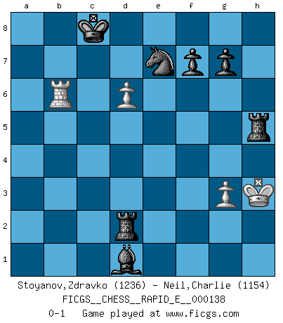 Last move : 0-1 2014 December 14 15:34:42 [Event "FICGS__CHESS__RAPID_E__000138"] [Site "FICGS"] [Date "2014.10.30"] [Round "1"] [White "Stoyanov,Zdravko"] [Black "Neil,Charlie"] [Result "0-1"] [WhiteElo "1236"] [BlackElo "1154"] 1.e4 e6 2.Nf3 d5 3.e5 c5 4.a3 Nc6 5.Bb5 Nge7 6.O-O Ng6 7.d4 Bd7 8.c3 a6 9.Bxc6 Bxc6 10.Bg5 Qb6 11.b4 cxb4 12.axb4 Bb5 13.Re1 Rc8 14.Nfd2 h6 15.Ra5 hxg5 16.Re3 Be7 17.g3 Kd7 18.Qg4 Rh7 19.Nf3 Qd8 20.Na3 Bc6 21.Nxg5 Bxg5 22.Rf3 Qe7 23.Rc5 b6 24.b5 axb5 25.Nxb5 Bxb5 26.Rxd5+ Kc6 27.Rd6+ Kb7 28.Qe4+ Kc7 29.d5 Rch8 30.c4 Ba4 31.Ra3 Rxh2 32.Kf1 Bd1 33.f4 Rh1+ 34.Kf2 R8h2+ 35.Ke3 Re1+ 36.Kd3 Rxe4 37.Ra7+ Kc8 38.Rxe7 Bc2+ 39.Kc3 Nxe7 40.fxg5 exd5 41.cxd5 Re3+ 42.Kd4 Rd3+ 43.Ke4 Re2+ 44.Kf4 Rd4+ 45.Kf3 Rxe5 46.Rxb6 Bd1+ 47.Kg2 Rxg5 48.d6 Rd2+ 49.Kh3 Rh5+ 0-1 French defense Kingside Castling by player White (move 6) Player Black won this chess game. Follow this game move after move (download)There are two types of sacrifices: correct ones and mine. (Mikhail Tal) Im Schach nämlich geht es darum, daß Ich des Gegners klein zu kriegen, sein Ego zu zerbrechen und zu zermahlen, seine Selbstachtung zu zertreten und zu verscharren und seine ganze mißachtenswerte sogenannte Persönlichkeit ein für alle Mal tot zu hacken und zu zerstampfen und dadurch die menschliche Gesellschaft von einer stinkenden Pestbeule zu befreien. Es ist ein königliches Spiel. (Robert James Fischer) Siempre es mucho mejor sacrificar las piezas de tu oponente. (Savielly Tartakover) Je fais ceci parce que dans cinquante coups j'obtiendrai cela; je m'appelle Mikhail Moisevitch Botvinnik. (Botvinnik) When you've done things right people won't know you've done anything at all. (Futurama)