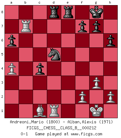 Last move : 0-1 2015 January 21 20:26:17 [Event "FICGS__CHESS__CLASS_B__000212"] [Site "FICGS"] [Date "2014.10.31"] [Round "1"] [White "Andreoni,Mario"] [Black "Alban,Alexis"] [Result "0-1"] [WhiteElo "1800"] [BlackElo "1971"] 1.c4 e5 2.Nc3 Nf6 3.Nf3 Nc6 4.Qc2 Bb4 5.g3 O-O 6.Bg2 h6 7.O-O Re8 8.a3 Bxc3 9.bxc3 e4 10.Nd4 Ne5 11.c5 d6 12.cxd6 Qxd6 13.a4 c5 14.Nb5 Qd8 15.c4 Bg4 16.Re1 a6 17.Nc3 Qd4 18.Rb1 Nd3 19.Rf1 Nb4 20.Qb3 Be6 21.d3 exd3 22.exd3 Qxd3 23.Nd5 Qxb3 24.Rxb3 Nbxd5 25.cxd5 Bxd5 26.Bxd5 Nxd5 27.Rxb7 c4 28.Rd1 Rad8 0-1 English Opening Kingside Castling by player Black (move 5) Kingside Castling by player White (move 7) Player Black won this chess game. Follow this game move after move (download)We cannot resist the fascination of sacrifice, since a passion for sacrifices is part of a Chessplayer's nature. (Rudolf Spielman) Fischer ist das größte Genie, das je vom Schachhimmel heruntergestiegen ist. (Mikhail Nekhemyevich Tal) El Ajedrez es una manera fabulosa para que los niños aprendan a autovalorarse y a autoestimarse. (Saudin Robovic) On a dit que l'homme se distingue de l'animal par le fait qu'il achète plus de livres qu'il ne peut en lire. Je voudrais suggérer qu'inclure à la liste des livres quelques livres d'échecs rendrait la distinction manifeste. (Edward Lasker) Children in the dark cause accidents, accidents in the dark cause children. (Unknown)
