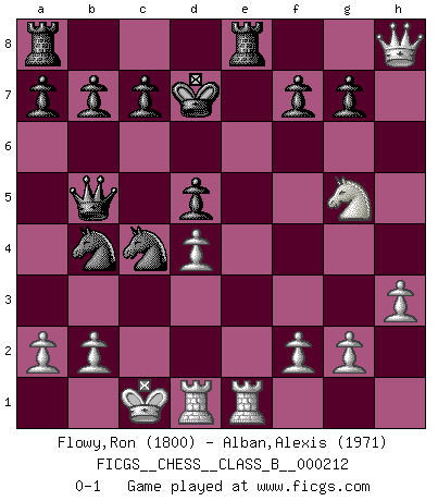 Last move : 0-1 2015 January 28 20:54:36 [Event "FICGS__CHESS__CLASS_B__000212"] [Site "FICGS"] [Date "2014.10.31"] [Round "1"] [White "Flowy,Ron"] [Black "Alban,Alexis"] [Result "0-1"] [WhiteElo "1800"] [BlackElo "1971"] 1.e4 Nf6 2.e5 Nd5 3.d4 d6 4.c4 Nb6 5.exd6 exd6 6.Nc3 Nc6 7.h3 Bf5 8.Be3 Be7 9.Nf3 O-O 10.Be2 d5 11.Bd3 Bxd3 12.Qxd3 Nxc4 13.O-O-O Qd6 14.Nb5 Qd7 15.Bg5 Nb4 16.Qe2 Bxg5+ 17.Nxg5 Rfe8 18.Qh5 Qxb5 19.Qxh7+ Kf8 20.Qh8+ Ke7 21.Rhe1+ Kd7 0-1 Alekhine's defense : Exchange variation Kingside Castling by player Black (move 9) Queenside Castling by player White (move 13) Player Black won this chess game. Follow this game move after move (download)In Chess, as it is played by masters, chance is practically eliminated. (Emanuel Lasker) Privat ist Kortschnoi kein schlechter Mensch, sehr sympathisch. Aber während des Spiels ist er grausam. Er will dich töten. (Miguel Najdorf) Si tu oponente no puede hacer nada activo, entonces no apures la posición; En vez de eso, dejalo estar sentado ahí, sufriendo y rogandote por un empate. (Jeremy Silman) Comme les marins qui ont mille raisons différentes d'aller en mer, les joueurs d'échecs en ont tout autant avant de s'installer devant une table et jouer... (Vincent Bertignac, philosophe) The man who strikes first admits that his ideas have given out. (Chinese proverb)