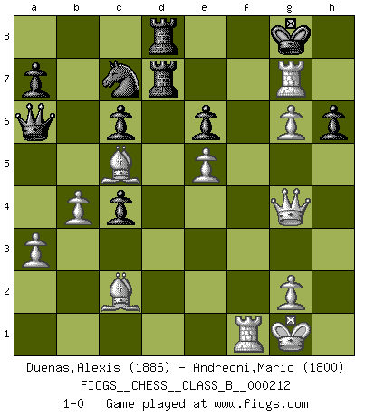 Last move : 1-0 2015 January 2 16:34:14 [Event "FICGS__CHESS__CLASS_B__000212"] [Site "FICGS"] [Date "2014.10.31"] [Round "1"] [White "Duenas,Alexis"] [Black "Andreoni,Mario"] [Result "1-0"] [WhiteElo "1886"] [BlackElo "1800"] 1.d4 Na6 2.e4 c6 3.Nf3 d6 4.Nc3 Nc7 5.Bd3 Bg4 6.h3 Bxf3 7.Qxf3 Nf6 8.O-O g6 9.e5 dxe5 10.dxe5 Nd7 11.Qe2 Bg7 12.f4 O-O 13.Be3 Nb6 14.Bf2 Ncd5 15.Nxd5 Nxd5 16.Qe4 Qa5 17.c4 Nc7 18.a3 Rfd8 19.b4 Qa4 20.Bc2 Qa6 21.f5 e6 22.fxg6 fxg6 23.h4 b5 24.h5 bxc4 25.hxg6 h6 26.Bc5 Rd7 27.Rf7 Rad8 28.Raf1 Nd5 29.Qg4 Nc7 30.Rxg7+ 1-0 Queen's pawn Kingside Castling by player White (move 8) Kingside Castling by player Black (move 12) Player White won this chess game. Follow this game move after move (download)Fischer Chess play was always razor-sharp, rational and brilliant. One of the best ever. (Dave Regis) Ich las kürzlich ein Buch von Nietzsche. Er sagte Religion verdumme nur die Menschen. Ich stimme zu. (Robert James Fischer) El Ajedrez es una hermosa aventura. (Bent Larsen) J'apprécie les joueurs d'est-indienne, c'est grâce à eux que je nourris ma famille depuis tant d'années. (Petrosian) No enterprise is more likely to succeed than one concealed from the enemy until it is ripe for execution. (Niccolo Machiavelli)