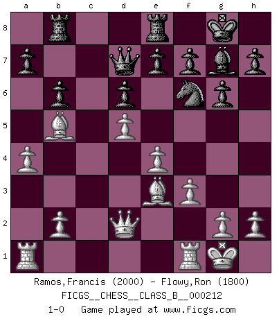 Last move : 1-0 2014 December 6 18:27:29 [Event "FICGS__CHESS__CLASS_B__000212"] [Site "FICGS"] [Date "2014.10.31"] [Round "1"] [White "Ramos,Francis"] [Black "Flowy,Ron"] [Result "1-0"] [WhiteElo "2000"] [BlackElo "1800"] 1.e4 c5 2.Nf3 g6 3.d4 cxd4 4.Nxd4 Nc6 5.c4 Nf6 6.Nc3 d6 7.Be2 Nxd4 8.Qxd4 Bg7 9.Be3 O-O 10.Qd2 Be6 11.f3 b6 12.O-O Rc8 13.Nd5 Bxd5 14.cxd5 Qd7 15.Ba6 Rb8 16.a4 Rfe8 17.Bb5 1-0 Sicilian : Hungarian variation Kingside Castling by player Black (move 9) Kingside Castling by player White (move 12) Player White won this chess game. Follow this game move after move (download)Modern Chess is too much concerned with things like Pawn structure. Forget it, Checkmate ends the game. (Nigel Short) Woher wissen wir, daß der Neanderthaler Blindschach gespielt hat? -- Bei Ausgrabungen wurden keine Schachbretter und Figuren gefunden. (Anonymous) No es una movida, aún la mejor movida que tu debas buscar, sino un plan comprensible. (Eugene Znosko-Borovsky) Ce qui caractérise les parties de combat, c'est que si le défenseur a constamment de difficiles problèmes à résoudre, l'attaquant doit chercher sans relâche de nouvelles possibilités d'attaque. (Koblentz) I've lost money so fast in these clubs it's left me reeling. I've read every poker book ever written, but the only way to get better at the game is to go out and play with people who are really good. The problem is, you stand to lose a lot of money doing it. (Matt Damon)