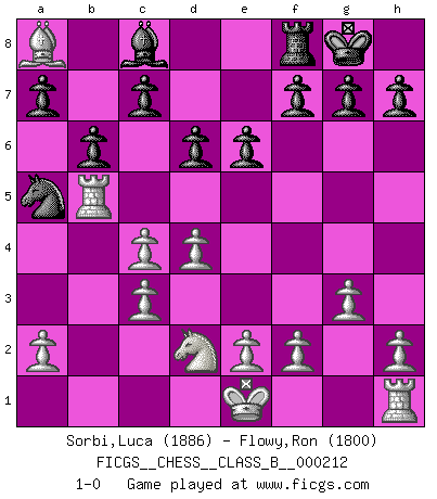 Last move : 1-0 2014 November 5 2:7:27 [Event "FICGS__CHESS__CLASS_B__000212"] [Site "FICGS"] [Date "2014.10.31"] [Round "1"] [White "Sorbi,Luca"] [Black "Flowy,Ron"] [Result "1-0"] [WhiteElo "1886"] [BlackElo "1800"] 1.d4 Nf6 2.c4 e6 3.Nf3 Bb4+ 4.Bd2 Qe7 5.g3 Nc6 6.Bg2 Bxd2+ 7.Qxd2 Ne4 8.Qc2 Qb4+ 9.Nc3 Nxc3 10.Qxc3 Qxc3+ 11.bxc3 d6 12.Nd2 O-O 13.Rb1 Na5 14.Rb5 b6 15.Bxa8 1-0 Bogo-Indian defense, Nimzovich variation Kingside Castling by player Black (move 12) Player White won this chess game. Follow this game move after move (download)Chess is a matter of delicate judgment, knowing when to punch and how to duck. (Bobby Fischer) Dieses schreckliche Gefühl, dass ich gegen eine Maschine spielte, die niemals Fehler macht, zerschmetterte meinen Widerstand. (Mark Taimanov) Solo los afeminados hacen el Enroque. (Rob Sillars) On croit qu'il y a plus de mauvais joueurs que de bons joueurs, c'est faux : Il y a autant de joueurs qui gagnent que de joueurs qui perdent. (Philippe Geluck) Philosophers use a language that is already deformed as though by shoes that are too tight. (Ludwig Wittgenstein)