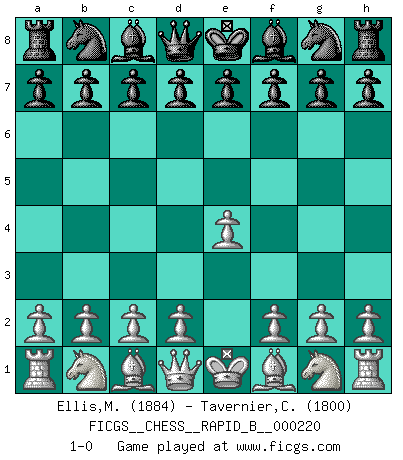 Last move : 1-0 2014 December 1 12:24:29 [Event "FICGS__CHESS__RAPID_B__000220"] [Site "FICGS"] [Date "2014.10.31"] [Round "1"] [White "Ellis,Maurice"] [Black "Tavernier,Christopher"] [Result "1-0"] [WhiteElo "1884"] [BlackElo "1800"] 1.e4 1-0 This chess game has been lost on time (started : 2014.10.31 23:19:11) King's pawn Opening Player White won this chess game. Follow this game move after move (download)I prefer to lose a really good game than to win a bad one. (David Levy) Alle Schachspieler sollten auch ein Hobby haben. (Savielly Grigorievitsch Tartakower) Me siento como si fuera una pieza en una partida de Ajedrez, cuando mi oponente me indica: esa pieza no puede ser movida. (Soren Kierkegaard) Mon pion favori sur ma case favorite ! Bronstein en parlant d'un coup de pion en h5 quand il avait les Noirs. Ah, the Socrating method. The best way we have of teaching everything-apart from juggling chainsaws. (Gregory House, House M.D.)