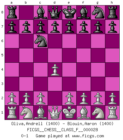 Last move : 0-1 2007 April 4 15:45:39 [Event "FICGS__CHESS__CLASS_F__000028"] [Site "FICGS"] [Date "2007.02.23"] [Round "1"] [White "Oliva,Andrell"] [Black "Blouin,Aaron"] [Result "0-1"] [WhiteElo "1400"] [BlackElo "1400"] 1.d4 Nc6 0-1 This chess game has been lost on time (started : 2007.02.23 4:54:9) Queen's pawn : Lundin (Kevitz-Mikenas) defense Player Black won this chess game. Follow this game move after move (download)A sacrifice is best refuted by accepting it. (Wilhelm Steinitz) Über die Verhaftung Bobby Fischers: Warum es die Bush-Administration für nötig befindet einen 61 Jahre alten Mann zu hetzten, der für niemanden ausser sich selbste eine Gefahr darstellt ist ein Rätsel. (Nigel Short) El Ajedrez es en su esencia, un juego. En su forma, un arte. Y en su ejecución, una ciencia. (Baron Tassilo) Même si l'adversaire joue le coup analysé précédemment, recommencez l'analyse en voyant la nouvelle position. Première règle de Blumenfeld All maxims have their antagonist maxims; proverbs should be sold in pairs, a single one being but a half truth. (William Mathews)