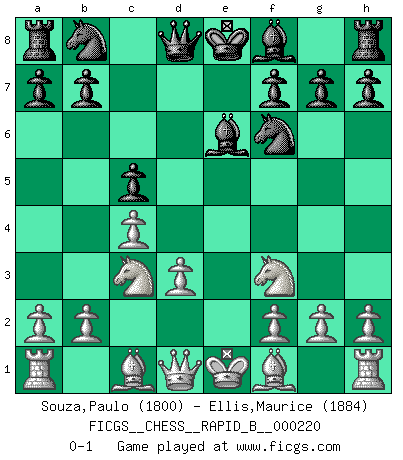 Last move : 0-1 2014 December 12 13:30:11 [Event "FICGS__CHESS__RAPID_B__000220"] [Site "FICGS"] [Date "2014.10.31"] [Round "1"] [White "Souza,Paulo"] [Black "Ellis,Maurice"] [Result "0-1"] [WhiteElo "1800"] [BlackElo "1884"] 1.e4 d5 2.exd5 Nf6 3.c4 c6 4.Nc3 Bf5 5.Nf3 e6 6.dxe6 Bxe6 7.d3 c5 0-1 This chess game has been lost on time (started : 2014.10.31 23:19:11) Scandinavian gambit Player Black won this chess game. Follow this game move after move (download)There must have been a time when men were demigods, or they could not have invented Chess. (Gustav Schenk) Gott hat gewollt, dass ich Champion werde. (Surab Azmajparaschvili) Durante una competencia de Ajedrez, un Maestro de Ajedrez deberá ser una combinación de presa de caza y un Monge. (Alexander Alekhine) La solitude du joueur d'Echecs à l'approche du mat est semblable à celle du condamné. (Francis Szpiner) Whatever you do, don't be bored. This is absolutely the most exciting time we could have possibly hoped to be alive. And things are just starting. (From movie Waking life)