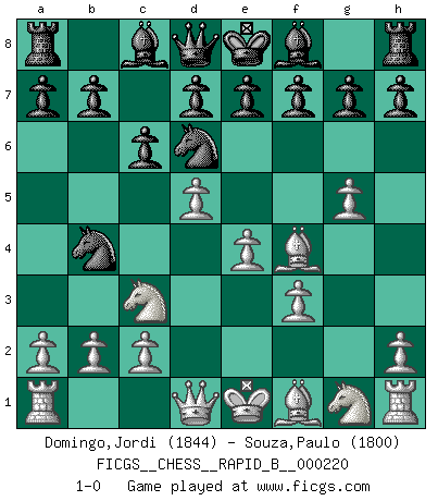 Last move : 1-0 2014 December 12 13:30:11 [Event "FICGS__CHESS__RAPID_B__000220"] [Site "FICGS"] [Date "2014.10.31"] [Round "1"] [White "Domingo,Jordi"] [Black "Souza,Paulo"] [Result "1-0"] [WhiteElo "1844"] [BlackElo "1800"] 1.g4 Nf6 2.g5 Ne4 3.d3 Nc5 4.d4 Ne4 5.f3 Nd6 6.e4 Nc6 7.d5 Nb4 8.Nc3 c6 9.Bf4 1-0 This chess game has been lost on time (started : 2014.10.31 23:19:11) Grob's attack Player White won this chess game. Follow this game move after move (download)It was clear to me that the vulnerable point of the American Grandmaster (Bobby Fischer) was in double-edged, hanging, irrational positions, where he often failed to find a win even in a won position. (Efim Geller) Wenn Dein Gegner dir ein Remis anbietet, versuch herauszufinden, weshalb er glaubt schlechter zu stehen. (Nigel Short) Ser exitoso en el Ajedrez te permite descubrir tu propia personalidad. Eso es lo que deseo para los niños de mi clase. (Saudin Robovic) D'abord les bases : Jouez et étudiez, puis étudiez et jouez, ensuite jouez et étudiez, puis étudiez et jouez. Deuxièmement : Donnez toujours le meilleur de vous-même ! (Ken Smith) When you don't know what to do, walk fast and look worried. (Anonymous)