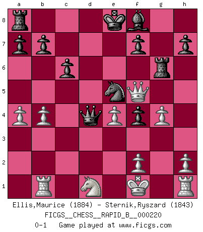 Last move : 0-1 2014 November 22 1:53:41 [Event "FICGS__CHESS__RAPID_B__000220"] [Site "FICGS"] [Date "2014.10.31"] [Round "1"] [White "Ellis,Maurice"] [Black "Sternik,Ryszard"] [Result "0-1"] [WhiteElo "1884"] [BlackElo "1843"] 1.d4 d5 2.c4 c6 3.Nf3 Nf6 4.Nc3 dxc4 5.a4 Bf5 6.Ne5 Nbd7 7.Nxc4 Qc7 8.g3 e5 9.dxe5 Nxe5 10.Bf4 Nfd7 11.e4 Be6 12.Qh5 g5 13.Nxe5 Nxe5 14.Bh3 Nd3+ 15.Kf1 Bxh3+ 16.Qxh3 gxf4 17.Qf5 Qb6 18.Nd1 Qd4 19.Rb1 Rg8 20.b4 Rg6 21.g4 Ne5 0-1 QGD Slav : Krause attack Player Black won this chess game. Follow this game move after move (download)Chess is thirty to forty percent psychology. You don't have this when you play a computer. I can't confuse it. (Judith Polgar) Ich verstehe Aljechins Kombinationen ganz gut; aber woher er diese Angriffschancen bekommt und wie er die Eröffnung behandelt das ist für mich ein Buch mit sieben Siegeln. (Rudolf Spielmann) El ganar no lo es todo... pero el perder es nada. (Mednis) Pour moi, les échecs ne sont pas un jeu mais un art. (Alexandre Alekhine) Good decisions come from experience, and experience comes from bad decisions. (Anonymous)