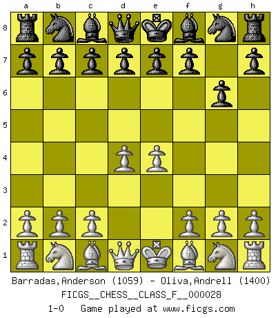 Last move : 1-0 2007 April 5 3:54:3 [Event "FICGS__CHESS__CLASS_F__000028"] [Site "FICGS"] [Date "2007.02.23"] [Round "1"] [White "Barradas,Anderson"] [Black "Oliva,Andrell"] [Result "1-0"] [WhiteElo "1059"] [BlackElo "1400"] 1.e4 g6 2.d4 1-0 This chess game has been lost on time (started : 2007.02.23 4:54:9) Robatsch (Modern) defense Player White won this chess game. Follow this game move after move (download)Chess is in its essence a game, in its form an art, and in its execution a science. (Baron Tassilo) Bogoljubow: Matt in vier Zügen! Tartakower: Ich verbitte mir jede Belästigung! (Savielly Grigorievitsch Tartakower) Muchos se han convertido en Maestros de Ajedrez, nadie se ha convertido en el Maestro del Ajedrez. (Siegbert Tarrasch) Je fais ceci parce que dans cinquante coups j'obtiendrai cela; je m'appelle Mikhail Moisevitch Botvinnik. (Botvinnik) All men can see these tactics whereby I conquer, but what none can see is the strategy out of which victory is evolved. (Sun Tzu)
