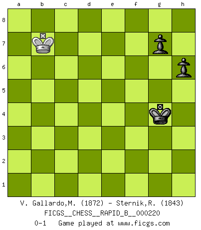 Last move : 0-1 2015 February 8 18:39:52 [Event "FICGS__CHESS__RAPID_B__000220"] [Site "FICGS"] [Date "2014.10.31"] [Round "1"] [White "V. Gallardo,Miguel"] [Black "Sternik,Ryszard"] [Result "0-1"] [WhiteElo "1872"] [BlackElo "1843"] 1.e4 c5 2.Nf3 Nc6 3.d4 cxd4 4.Nxd4 e5 5.Nf3 Nf6 6.Bg5 Bc5 7.c3 Bxf2+ 8.Ke2 Qb6 9.Nbd2 d5 10.exd5 Nxd5 11.Nc4 Qc5 12.Qd2 Be6 13.Nd6+ Qxd6 14.Kxf2 O-O 15.Kg1 h6 16.Bh4 e4 17.Nd4 e3 18.Qd3 Nxd4 19.Qxd4 Qb6 20.Qxb6 axb6 21.c4 Nf4 22.Re1 Rxa2 23.Rxe3 Rxb2 24.Bg3 Nh5 25.Be5 Rc2 26.h3 Bxc4 27.Bxc4 Rxc4 28.g4 Nf4 29.Bxf4 Rxf4 30.Kg2 f5 31.Kg3 Re4 32.Rxe4 fxe4 33.Re1 Rf3+ 34.Kg2 Rf4 35.Rb1 Rf6 36.Re1 Re6 37.Kf2 e3+ 38.Kf3 e2 39.Rxe2 Rxe2 40.Kxe2 Kf7 41.Kd3 Kf6 42.Kc4 Kg5 43.Kb5 Kh4 44.Kxb6 Kxh3 45.Kxb7 Kxg4 0-1 Sicilian : Labourdonnais-Loewenthal variation Kingside Castling by player Black (move 14) 10 pieces endgame at move 39 : White KRPP , Black KRPPPP WHITE : King + 1 Rook 2 Pawns BLACK : King + 1 Rook 4 Pawns 9 pieces endgame at move 39 : White KPP , Black KRPPPP WHITE : King + 2 Pawns BLACK : King + 1 Rook 4 Pawns 8 pieces endgame at move 40 : White KPP , Black KPPPP WHITE : King + 2 Pawns BLACK : King + 4 Pawns 7 pieces endgame at move 44 : White KPP , Black KPPP WHITE : King + 2 Pawns BLACK : King + 3 Pawns 6 pieces endgame at move 44 : White KP , Black KPPP WHITE : King + 1 Pawn BLACK : King + 3 Pawns 5 pieces endgame at move 45 : White KP , Black KPP WHITE : King + 1 Pawn BLACK : King + 2 Pawns 4 pieces endgame at move 45 : White K , Black KPP WHITE : King + BLACK : King + 2 Pawns Player Black won this chess game. Follow this game move after move (download)You may learn much more from a game you lose than from a game you win. You will have to lose hundreds of games before becoming a good player. (Jose Raul Capablanca) Ich las kürzlich ein Buch von Nietzsche. Er sagte Religion verdumme nur die Menschen. Ich stimme zu. (Robert James Fischer) Nos gusta pensar. (Gary Kasparov) Même un GMI sait rarement calculer sur plus de cinq coups une attaque à sacrifices. (Rudolf Spielmann) Nowadays, anyone who cannot speak English and is incapable of using the Internet is regarded as backward. (Al-Waleed bin Talal)