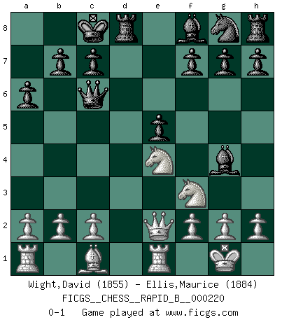 Last move : 0-1 2014 December 15 1:46:2 [Event "FICGS__CHESS__RAPID_B__000220"] [Site "FICGS"] [Date "2014.10.31"] [Round "1"] [White "Wight,David"] [Black "Ellis,Maurice"] [Result "0-1"] [WhiteElo "1855"] [BlackElo "1884"] 1.d4 d5 2.e4 dxe4 3.Nc3 e5 4.Nxe4 Qxd4 5.Bd3 Nc6 6.Nf3 Qd8 7.Qe2 Bg4 8.Bb5 Qd7 9.O-O a6 10.Bxc6 Qxc6 11.Re1 O-O-O 0-1 This chess game has been lost on time (started : 2014.10.31 23:19:11) Blackmar gambit Kingside Castling by player White (move 9) Queenside Castling by player Black (move 11) Player Black won this chess game. Follow this game move after move (download)I have always a slight feeling of pity for the man who has no knowledge of Chess. (Siegbert Tarrasch) Obendrein hat der FIDE-Präsident den Revolutionsführer Gaddafi zum »Großmeister« ernannt, am Ende der WM. Das ist lächerlich! (Joel Lautier) Botvinnik trató de alejar el misterio referente al Ajedrez, siempre relacionandolo a situaciones de la vida diaria. Solía llamar al Ajedrez un problema inexacto típico, similar a aquellos en que la gente tiene siempre que resolver a cada día. (Garry Kasparov) Je ne crois pas en la psychologie, je crois aux bons coups. (Robert Fischer) He who is a good ruler must first have been ruled. (Aristotle)