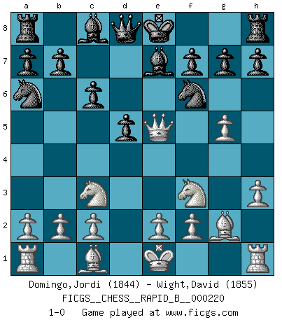 Last move : 1-0 2014 December 13 13:36:31 [Event "FICGS__CHESS__RAPID_B__000220"] [Site "FICGS"] [Date "2014.10.31"] [Round "1"] [White "Domingo,Jordi"] [Black "Wight,David"] [Result "1-0"] [WhiteElo "1844"] [BlackElo "1855"] 1.g4 d5 2.Bg2 c6 3.h3 e5 4.d4 exd4 5.Qxd4 Na6 6.Nf3 Nf6 7.Nc3 Bc5 8.Qe5+ Be7 9.g5 1-0 This chess game has been lost on time (started : 2014.10.31 23:19:11) Grob's attack Player White won this chess game. Follow this game move after move (download)I still hope to kill Fischer. (Boris Spassky) Im Spitzenschach von heute geht es nur um Vorbereitung, um tiefgründige, sorgfältige Eröffnungsvorbereitung. (Nigel Short) El Ajedrez es un invernadero donde los frutos del carácter pueden madurar mas completamente que en la vida. (Edward Morgan Foster) Même si l'adversaire joue le coup analysé précédemment, recommencez l'analyse en voyant la nouvelle position. Première règle de Blumenfeld It is a good thing for an uneducated man to read books of quotations. (Winston Churchill)