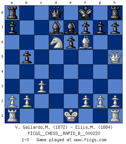 Last move : 1-0 2014 December 11 15:20:23 [Event "FICGS__CHESS__RAPID_B__000220"] [Site "FICGS"] [Date "2014.10.31"] [Round "1"] [White "V. Gallardo,Miguel"] [Black "Ellis,Maurice"] [Result "1-0"] [WhiteElo "1872"] [BlackElo "1884"] 1.d4 d5 2.Nc3 Nf6 3.Bg5 e6 4.Nf3 c5 5.e4 dxe4 6.Nxe4 Nc6 7.Bb5 Bd7 8.c3 cxd4 9.Nxd4 Be7 10.Nxc6 bxc6 11.Bxf6 cxb5 12.Nd6+ Kf8 13.Qh5 1-0 Richter-Veresov attack Player White won this chess game. Follow this game move after move (download)Chess holds its master in its own bonds, shackling the mind and brain so that the inner freedom of the very strongest must suffer. (Albert Einstein) Der vorletzte Fehler gewinnt. (Savielly Grigorievitsch Tartakower) El estómago es una parte esencial del maestro de Ajedrez. (Bent Larsen) Il vaut mieux sacrifier les pièces de l'adversaire. (Xavier Tartacover) SEO proverb : Make your website optimized for human beings, not for search engines.