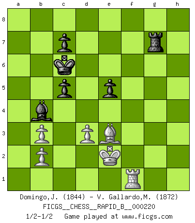 Last move : 1/2-1/2 2015 January 25 6:6:16 [Event "FICGS__CHESS__RAPID_B__000220"] [Site "FICGS"] [Date "2014.10.31"] [Round "1"] [White "Domingo,Jordi"] [Black "V. Gallardo,Miguel"] [Result "1/2-1/2"] [WhiteElo "1844"] [BlackElo "1872"] 1.g4 e5 2.c4 Nc6 3.Nc3 d6 4.h3 Be6 5.d3 d5 6.cxd5 Bxd5 7.Nxd5 Qxd5 8.Nf3 O-O-O 9.Bg2 h5 10.Qb3 Bb4+ 11.Kd1 Qxb3+ 12.axb3 hxg4 13.Ng5 Nh6 14.Bxc6 bxc6 15.Rxa7 Kd7 16.Ra4 c5 17.hxg4 Nxg4 18.Rg1 Nxf2+ 19.Kc2 Nh3 20.Nxh3 Rxh3 21.Rxg7 Rh2 22.Rxf7+ Kc6 23.Kd1 Rg8 24.Ra6+ Kb7 25.Raf6 R8g2 26.Rf1 Rxe2 27.Rh7 Rhg2 28.Rg7 Rxg7 29.Kxe2 Kc6 30.Be3 1/2-1/2 Grob's attack Queenside Castling by player Black (move 8) This chess game ended in a draw. Follow this game move after move (download)When the Chess game is over, the Pawn and the King go back to the same box. (Irish saying) Frage: Gibt es etwas was Sie mehr lieben als Autobahnen ohne Tempobegrenzungen? - Antwort: Deutsche Frauen ohne Tempobegrenzungen. (Loek van Wely) Bobby Fischer es el mas grande genio de Ajedrez de todos los tiempos. (Alexander Kotov) Plusieurs personnes se sont demandées comment Tal faisait pour gagner... En fait, c'est très simple ! Il met ses pièces au centre de l'échiquier et les sacrifie quelque part ! (David Bronstein) See no evil, hear no evil, speak no evil. (The 3 monkeys)
