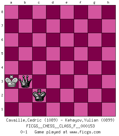 Last move : 0-1 2014 November 5 21:45:55 [Event "FICGS__CHESS__CLASS_F__000153"] [Site "FICGS"] [Date "2014.10.31"] [Round "1"] [White "Cavaille,Cedric"] [Black "Kehayov,Yulian"] [Result "0-1"] [WhiteElo "1089"] [BlackElo "0899"] 1.d4 d5 2.Nf3 Nc6 3.e3 e6 4.c4 Nf6 5.Nc3 a6 6.g3 Be7 7.b3 O-O 8.Bg2 Bd7 9.O-O dxc4 10.bxc4 Na7 11.Bd2 b6 12.Re1 c5 13.Rb1 Rb8 14.Ne5 h6 15.Nxd7 Qxd7 16.Rb2 b5 17.Qe2 cxd4 18.exd4 bxc4 19.Rxb8 Rxb8 20.Qxc4 Nb5 21.Nxb5 Qxb5 22.Qxb5 Rxb5 23.f4 Bb4 24.Bxb4 Rxb4 25.Rd1 a5 26.d5 exd5 27.Bxd5 Nxd5 28.Rxd5 Rb1+ 29.Kf2 Rb2+ 30.Ke3 Rxa2 31.h4 Ra3+ 32.Rd3 Rxd3+ 33.Kxd3 f6 34.Kc4 Kf7 35.Kb5 Ke6 36.g4 g5 37.hxg5 fxg5 38.f5+ Kf6 39.Kxa5 h5 40.gxh5 Kxf5 41.h6 Kg6 42.h7 Kxh7 43.Kb4 Kh6 44.Kc3 Kh5 45.Kd3 Kh4 46.Ke3 Kg3 47.Ke2 Kg2 48.Ke3 g4 49.Ke2 g3 50.Ke1 Kg1 51.Ke2 g2 52.Ke1 Kh2 53.Kf2 g1Q+ 54.Kf3 Qg5 55.Ke4 Kg2 56.Kd4 Qe7 57.Kd5 Kf3 58.Kc4 Qd6 59.Kc3 Qd5 60.Kc2 Qd4 61.Kb3 Qc5 62.Kb2 Qc4 63.Ka3 Qb5 64.Ka2 Ke3 65.Ka3 Kd3 66.Ka2 Kc2 67.Ka3 Qb3+ 0-1 Queen's pawn game, Chigorin variation Kingside Castling by player Black (move 7) Kingside Castling by player White (move 9) 10 pieces endgame at move 32 : White KPPP , Black KRPPPP WHITE : King + 3 Pawns BLACK : King + 1 Rook 4 Pawns 9 pieces endgame at move 33 : White KPPP , Black KPPPP WHITE : King + 3 Pawns BLACK : King + 4 Pawns 8 pieces endgame at move 37 : White KPPP , Black KPPP WHITE : King + 3 Pawns BLACK : King + 3 Pawns 7 pieces endgame at move 37 : White KPP , Black KPPP WHITE : King + 2 Pawns BLACK : King + 3 Pawns 6 pieces endgame at move 39 : White KPP , Black KPP WHITE : King + 2 Pawns BLACK : King + 2 Pawns 5 pieces endgame at move 40 : White KPP , Black KP WHITE : King + 2 Pawns BLACK : King + 1 Pawn 4 pieces endgame at move 40 : White KP , Black KP WHITE : King + 1 Pawn BLACK : King + 1 Pawn 3 pieces endgame at move 42 : White K , Black KP WHITE : King + BLACK : King + 1 Pawn Promotion Queen by player Black (move 53) Player Black won this chess game. Follow this game move after move (download)There just isn't enough televised Chess. (David Letterman) Ein Schachgenie ist jemand der verdammt gut Schach spielt. (Jonathan Levitt) Todo lo que importa ante el tablero de Ajedrez son buenas jugadas. (Bobby Fischer) Le plus grand jeu de l'esprit jamais inventé, plus vous l'apprenez, plus vous y prenez du plaisir. (Garry Kasparov) Life is like internet, nothing interesting, but noone want to leave it. (Ilmars Cirulis)