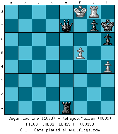 Last move : 0-1 2015 January 30 7:34:33 [Event "FICGS__CHESS__CLASS_F__000153"] [Site "FICGS"] [Date "2014.10.31"] [Round "1"] [White "Segur,Laurine"] [Black "Kehayov,Yulian"] [Result "0-1"] [WhiteElo "1078"] [BlackElo "0899"] 1.d4 d5 2.e3 e6 3.Bd3 Nf6 4.b3 Bb4+ 5.Bd2 Bxd2+ 6.Qxd2 O-O 7.Nf3 h6 8.c4 c6 9.Bc2 dxc4 10.bxc4 Na6 11.O-O b6 12.Re1 c5 13.Ne5 Nd7 14.Nxd7 Qxd7 15.Be4 Bb7 16.Bxb7 Qxb7 17.Qd3 cxd4 18.exd4 Rad8 19.Nc3 Nb4 20.Qe4 Qxe4 21.Rxe4 Nc2 22.Rc1 Nb4 23.Rb1 Nc6 24.Nb5 a6 25.Nc7 Rxd4 26.Rbe1 a5 27.Kf1 Rxe4 28.Rxe4 Nb4 29.Ke2 Nxa2 30.Kd3 Rc8 31.Nb5 Nb4+ 32.Kc3 Nd5+ 33.Kd4 Nc7 34.Ke5 Nxb5 35.cxb5 Rc5+ 36.Kd6 Rxb5 37.f4 a4 38.Rxa4 Rb1 39.Ra8+ Kh7 40.g4 Kg6 41.h4 b5 42.Ke5 b4 43.f5+ exf5 44.gxf5+ Kh7 45.Kd6 b3 46.Ke7 Re1+ 47.Kxf7 b2 48.Rb8 b1Q 49.Rg8 Qb3+ 50.Kf8 Qb4+ 51.Kf7 Qb7+ 52.Kf8 Qe7+ 0-1 Queen's pawn game Kingside Castling by player Black (move 6) Kingside Castling by player White (move 11) 10 pieces endgame at move 44 : White KRPP , Black KRPPPP WHITE : King + 1 Rook 2 Pawns BLACK : King + 1 Rook 4 Pawns 9 pieces endgame at move 47 : White KRPP , Black KRPPP WHITE : King + 1 Rook 2 Pawns BLACK : King + 1 Rook 3 Pawns Promotion Queen by player Black (move 48) Player Black won this chess game. Follow this game move after move (download)Chess is a part of culture and if a culture is declining then Chess too will decline. (Mikhail Botvinnik) Ihnen, Herr Lasker, habe ich nur drei Worte zu sagen: Schach und matt. (Siegbert Tarrasch) El Ajedrez es tan inspirador que yo no creo que un buen jugador sea capaz de tener un pensamiento malo durante una partida. (Wilhelm Steinitz) L'attaque fait le spectacle, la défense gagne les matchs. (Dicton footballistique) History is a gallery of pictures in which there are few originals and many copies. (Alexis de Tocqueville)