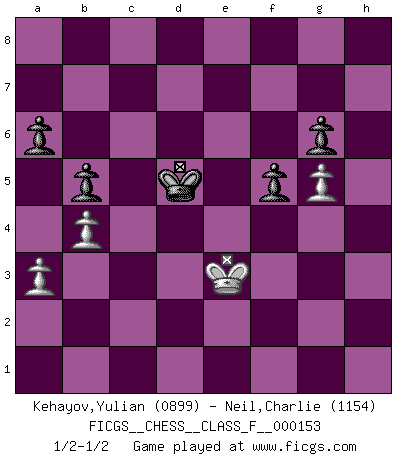 Last move : 1/2-1/2 2014 December 8 0:0:58 [Event "FICGS__CHESS__CLASS_F__000153"] [Site "FICGS"] [Date "2014.10.31"] [Round "1"] [White "Kehayov,Yulian"] [Black "Neil,Charlie"] [Result "1/2-1/2"] [WhiteElo "0899"] [BlackElo "1154"] 1.e4 c5 2.Nf3 Nc6 3.d4 cxd4 4.Nxd4 Nf6 5.Be2 Nxe4 6.O-O Qb6 7.Nxc6 dxc6 8.Bf3 Nd6 9.Nc3 g6 10.Be3 Qc7 11.Ne4 Bg7 12.c3 O-O 13.Nxd6 Qxd6 14.Qxd6 exd6 15.Rad1 d5 16.b3 Bxc3 17.Bd4 Bxd4 18.Rxd4 Be6 19.h3 Rfe8 20.Re1 h5 21.Re3 a6 22.g4 hxg4 23.Bxg4 Bxg4 24.hxg4 Rxe3 25.fxe3 Re8 26.Kf2 Kg7 27.Kf3 f6 28.e4 Re5 29.exd5 Rxd5 30.Rxd5 cxd5 31.Kf4 Kf7 32.g5 f5 33.Ke5 d4 34.Kxd4 Ke6 35.Ke3 Kd5 36.Kf4 Kd4 37.b4 b5 38.a3 Kd5 39.Ke3 Ke5 40.Kf3 Kd5 41.Ke3 Kc4 42.Kf4 Kd5 43.Ke3 1/2-1/2 Sicilian defense Kingside Castling by player White (move 6) Kingside Castling by player Black (move 12) 10 pieces endgame at move 30 : White KPPP , Black KPPPPP WHITE : King + 3 Pawns BLACK : King + 5 Pawns 9 pieces endgame at move 34 : White KPPP , Black KPPPP WHITE : King + 3 Pawns BLACK : King + 4 Pawns This chess game ended in a draw. Follow this game move after move (download)What is the difference between chess and football? Everybody understands football, but nobody plays it. Everybody plays chess, but nobody understands it. Everything is relative. (Vladimir Kramnik) Es gibt zwei Arten von Opfern: Korrekte und meine. (Mikhail Nekhemyevich Tal) Los Peones son el alma de una partida de Ajedrez. (Francois Andre Danican Philidor) On est toujours la mazette de quelqu'un d'autre. (Anonyme) Always two there are. No more no less. A master, and an apprentice. (Master Yoda in Star Wars ep.1)