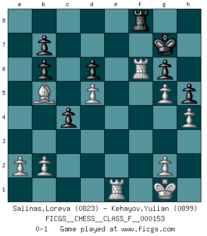 Last move : 0-1 2015 March 26 12:49:3 [Event "FICGS__CHESS__CLASS_F__000153"] [Site "FICGS"] [Date "2014.10.31"] [Round "1"] [White "Salinas,Loreva"] [Black "Kehayov,Yulian"] [Result "0-1"] [WhiteElo "0823"] [BlackElo "0899"] 1.Nc3 e5 2.e4 Nf6 3.Nd5 Nxd5 4.exd5 c6 5.Qh5 g6 6.Qxe5+ Qe7 7.Nf3 Qxe5+ 8.Nxe5 Bg7 9.Nc4 cxd5 10.Nd6+ Ke7 11.Nb5 Be5 12.d4 Bg7 13.Nc7 d6 14.Bb5 Nd7 15.Nxa8 Nb6 16.Nxb6 axb6 17.O-O Bd7 18.Re1+ Be6 19.Bg5+ Bf6 20.f4 Bxg5 21.fxg5 h6 22.h4 h5 23.c4 dxc4 24.d5 f6 25.Rxe6+ Kf7 26.Rae1 Rf8 27.Rxf6+ Kg7 0-1 This chess game has been lost on time (started : 2014.10.31 23:35:56) Dunst (Sleipner-Heinrichsen) Opening Kingside Castling by player White (move 17) Player Black won this chess game. Follow this game move after move (download)Human affairs are like a Chess game: only those who do not take it seriously can be called good players. (Hung Tzu Ch'eng) Der Knackpunkt bei der Konzentration ist, daß wir nur durch sie etwas Neues und Ungewöhnliches am Schachbrett finden können. Sie ist der einzige Weg durch neue neue Ideen eine Überraschung zu bereiten. (Garry Kasparov) El tablero es el mundo, las piezas es el fenomeno del universo, las reglas del juego son lo que llamamos leyes de la naturaleza y el jugador del lado opuesto, se encuentra oculto a nuestra vista. (Thomas Huxley) La tactique est l'élément le plus important du milieu de jeu. (Siegbert Tarrasch) Ah, beer! The cause of, and the solution to, all of life's problems. (Homer Simpson)