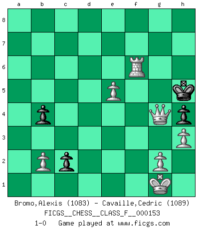 Last move : 1-0 2014 November 20 21:56:34 [Event "FICGS__CHESS__CLASS_F__000153"] [Site "FICGS"] [Date "2014.10.31"] [Round "1"] [White "Bromo,Alexis"] [Black "Cavaille,Cedric"] [Result "1-0"] [WhiteElo "1083"] [BlackElo "1089"] 1.d4 d5 2.c4 dxc4 3.Nc3 e6 4.a3 Nf6 5.e4 Be7 6.Bxc4 a6 7.Nf3 b5 8.Bb3 O-O 9.Be3 Ng4 10.h3 Nxe3 11.fxe3 c5 12.O-O c4 13.Ba2 Nc6 14.e5 Bg5 15.Nxg5 Qxg5 16.Qe2 Ne7 17.Ne4 Qh6 18.Bb1 Nf5 19.Rf4 Bb7 20.Bc2 Bxe4 21.Bxe4 Ng3 22.Qc2 Qh5 23.Bf3 Qh6 24.Bxa8 g5 25.Rg4 Rxa8 26.Rxg3 f5 27.Rf1 Qh4 28.Kh2 f4 29.exf4 Rf8 30.R1f3 Rxf4 31.Rxf4 Qxf4 32.Qc3 h5 33.Kg1 h4 34.Rg4 Qf5 35.Qf3 Kg7 36.Qxf5 exf5 37.Rxg5+ Kf7 38.d5 a5 39.Rxf5+ Kg6 40.Rf6+ Kg5 41.d6 b4 42.axb4 axb4 43.d7 c3 44.d8Q c2 45.Qg8+ Kh5 46.Qg4+ 1-0 Queen's gambit accepted Kingside Castling by player Black (move 8) Kingside Castling by player White (move 12) Promotion Queen by player White (move 44) Player White won this chess game. Follow this game move after move (download)We must make sure that Chess will not be like a dead language, very interesting, but for a very small group. (Sytze Faber) Den Ruhm habe ich schon, jetzt brauche ich noch das Geld. (Wilhelm Steinitz) Fischer era un maestro de claridad y un Rey del posicionamiento astuto. Sus oponentes podían ver hacia donde se dirigía pero eran impotentes para detenerlo. (Bruce Pandolfini) Votre seul travail dans les ouvertures est d'obtenir un milieu de partie jouable. (Lajos Portish) Some people are so afraid to die that they never begin to live. (Henry Van Dyke)