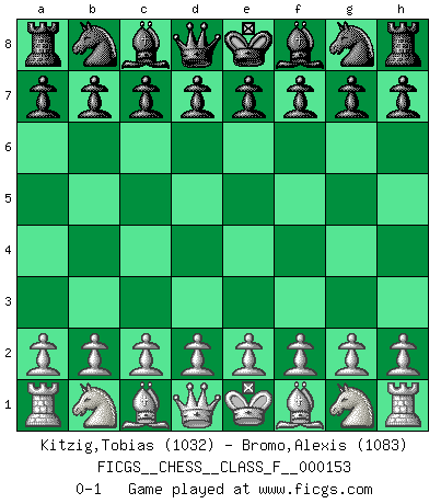 Last move : 0-1 2014 December 11 1:18:56 [Event "FICGS__CHESS__CLASS_F__000153"] [Site "FICGS"] [Date "2014.10.31"] [Round "1"] [White "Kitzig,Tobias"] [Black "Bromo,Alexis"] [Result "0-1"] [WhiteElo "1032"] [BlackElo "1083"] 0-1 This chess game has been lost on time (started : 2014.10.31 23:35:56) Player Black won this chess game. Follow this game move after move (download)It's just you and your opponent at the board and you're trying to prove something. (Bobby Fischer) Ich glaube nicht an Psychologie, ich glaube an gute Züge. (Robert James Fischer) Los asuntos humanos son como una partida de Ajedrez: solo aquellos que no lo toman seriamente, pueden ser llamados buenos jugadores. (Hung Tzu Ch'eng) La solitude du joueur d'Echecs à l'approche du mat est semblable à celle du condamné. (Francis Szpiner) All men can see these tactics whereby I conquer, but what none can see is the strategy out of which victory is evolved. (Sun Tzu)