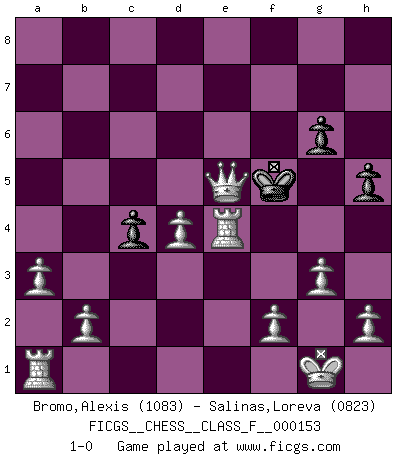 Last move : 1-0 2015 April 17 6:45:11 [Event "FICGS__CHESS__CLASS_F__000153"] [Site "FICGS"] [Date "2014.10.31"] [Round "1"] [White "Bromo,Alexis"] [Black "Salinas,Loreva"] [Result "1-0"] [WhiteElo "1083"] [BlackElo "0823"] 1.d4 e6 2.a3 d5 3.c4 dxc4 4.Nc3 Nc6 5.e3 b5 6.Nxb5 Qd5 7.Nxc7+ Kd7 8.Nxd5 exd5 9.Qa4 a5 10.Nf3 f6 11.Bd2 Nge7 12.g3 g6 13.Bh3+ f5 14.Ne5+ Ke8 15.Nxc6 Nxc6 16.Qxc6+ Bd7 17.Qxa8+ Kf7 18.Qxd5+ Be6 19.Qxa5 Be7 20.Bb4 Rc8 21.Bxe7 Kxe7 22.O-O Rd8 23.e4 fxe4 24.Bxe6 Kxe6 25.Qxd8 Kf5 26.Rfe1 h6 27.Qd7+ Kf6 28.Rxe4 h5 29.Qe7+ Kf5 30.Qe5+ 1-0 This chess game has been lost on time (started : 2014.10.31 23:35:56) Queen's pawn Kingside Castling by player White (move 22) Player White won this chess game. Follow this game move after move (download)Chess is the art of analysis. (Mikhail Botvinnik) Nicht daß Diemer aus Opportunismus Mitglied der NSDAP geworden wäre. Er war ein Fanatiker, in allem, was er tat. (Hans Ree) En la vida, como en el Ajedrez, los Peones propios obstruyen nuestro camino. La gran fortuna de un hombre, su comodidad, placer, hijos, libros, que deberían ayudarle a ganar, con mucha frecuencia lo ponen en Jaque Mate. (Charles Buxton) Les échecs, c'est la lutte contre l'erreur. (Johannes Zukertort) Life is painting a picture, not doing a sum. (Oliver Wendell Holmes, Jr.)