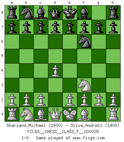Last move : 1-0 2007 April 8 22:22:18 [Event "FICGS__CHESS__CLASS_F__000028"] [Site "FICGS"] [Date "2007.02.23"] [Round "1"] [White "Sharland,Michael"] [Black "Oliva,Andrell"] [Result "1-0"] [WhiteElo "1400"] [BlackElo "1400"] 1.d4 Nf6 2.Nf3 1-0 This chess game has been lost on time (started : 2007.02.23 4:54:9) Queen's pawn game Player White won this chess game. Follow this game move after move (download)Chess is a terrible game. If you have no center, your opponent has a freer position. If you do have a center, then you really have something to worry about ! (Siegbert Tarrasch) Stelle das Brett so, daß die Sonne in die Augen deines Gegners scheint. (Ruy López) Yo siempre he tenido un ligero sentimiento de lástima por una persona que no tiene conocimiento del Ajedrez. (Siegbert Tarrasch) Il vaut mieux sacrifier les pièces de l'adversaire. (Xavier Tartacover) He who laughs last probably does not get the joke. (Unknown)