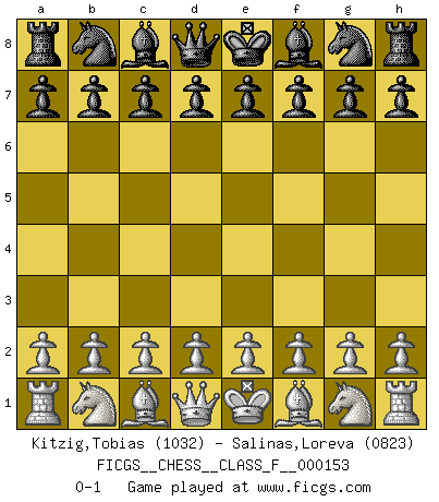 Last move : 0-1 2014 December 11 1:18:56 [Event "FICGS__CHESS__CLASS_F__000153"] [Site "FICGS"] [Date "2014.10.31"] [Round "1"] [White "Kitzig,Tobias"] [Black "Salinas,Loreva"] [Result "0-1"] [WhiteElo "1032"] [BlackElo "0823"] 0-1 This chess game has been lost on time (started : 2014.10.31 23:35:56) Player Black won this chess game. Follow this game move after move (download)Pawns are born free, yet they are everywhere in chains. (Rick Kennedy) Vom Schach wurde gesagt das Leben sei dafür nicht lange genug. Aber das ist der Fehler des Lebens, nicht des Schach'. (Irving Chernev) Botvinnik trataba de restarle el misterio al Ajedrez, siempre relacionandolo a situaciones de la vida ordinaria. El gustaba de llamar al Ajedrez un típico problema inexacto similar a aquellos de los cuales la gente siempre tiene que enfrentarse en la vida cotidiana. (Garry Kasparov) Nous sommes les pions de la mystérieuse partie d'Echecs jouée par Dieu. Il nous déplace, nous arrête, nous pousse encore, puis nous lance un à un dans la boîte du Néant. Epitaphe sur la tombe de David Janowsky (1868-1927). Humor is by far the most significant activity of the human brain. (Edward De Bono)