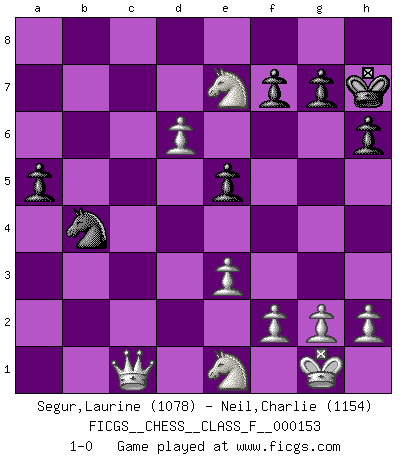 Last move : 1-0 2015 February 7 17:10:26 [Event "FICGS__CHESS__CLASS_F__000153"] [Site "FICGS"] [Date "2014.10.31"] [Round "1"] [White "Segur,Laurine"] [Black "Neil,Charlie"] [Result "1-0"] [WhiteElo "1078"] [BlackElo "1154"] 1.c4 Nf6 2.e3 e5 3.d3 d5 4.Be2 Bb4+ 5.Bd2 Bxd2+ 6.Qxd2 dxc4 7.dxc4 O-O 8.Nf3 Bf5 9.O-O Nc6 10.Rd1 Ne4 11.Qc2 Qe7 12.Bd3 Nb4 13.Qb3 c5 14.a3 Nc6 15.Bc2 Nd6 16.Bxf5 Nxf5 17.Nc3 Rab8 18.Nb5 a6 19.Nc3 Qf6 20.Ne4 Qe7 21.Rd3 Rfd8 22.Rad1 Na5 23.Qc3 Nc6 24.b4 Rxd3 25.Rxd3 cxb4 26.axb4 Nxb4 27.Rd2 Nc6 28.Ne1 h6 29.Rd5 Rd8 30.Qd3 Rxd5 31.cxd5 Nb4 32.Qc4 a5 33.Nc5 b6 34.Ne4 Qh4 35.Qc8+ Kh7 36.Qxf5+ Kg8 37.Nd6 Qe7 38.Nc8 Qf8 39.Nxb6 Qd6 40.Nc8 Qc5 41.d6 Qc1 42.Ne7+ Kh8 43.Qc8+ Kh7 44.Qxc1 1-0 English, 1...Nf6 (Anglo-Indian defense) Kingside Castling by player Black (move 7) Kingside Castling by player White (move 9) Player White won this chess game. Follow this game move after move (download)A win by an unsound combination, however showy, fills me with artistic horror. (Wilhelm Steinitz) Es ist schade, dass viele Schachsportler vergessen, wie wichtig Auftreten und angemessene Kleidung sind. (Alexandra Kosteniuk) Un mal día en el Ajedrez, es mejor que cualquier buen día en el trabajo. (Anonymous) Il vaut mieux sacrifier les pièces de l'adversaire. (Xavier Tartacover) Watch your thoughts; they become words. Watch your words; they become actions. Watch your actions; they become habits. Watch your habits; they become character. Watch your character; it becomes your destiny. (Frank Outlaw)