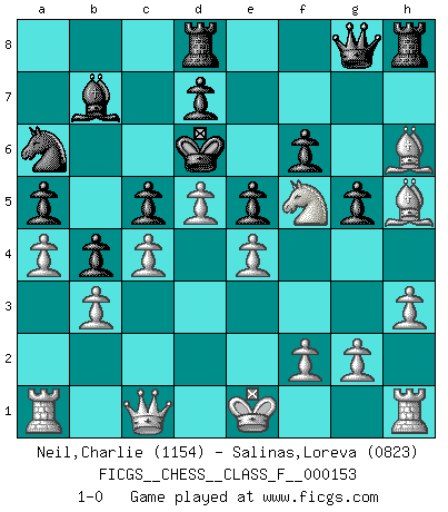 Last move : 1-0 2015 March 22 1:13:25 [Event "FICGS__CHESS__CLASS_F__000153"] [Site "FICGS"] [Date "2014.10.31"] [Round "1"] [White "Neil,Charlie"] [Black "Salinas,Loreva"] [Result "1-0"] [WhiteElo "1154"] [BlackElo "0823"] 1.Nf3 e6 2.d4 Bb4+ 3.c3 Bd6 4.e4 Qe7 5.Be3 e5 6.d5 c6 7.Bc4 b5 8.Bb3 c5 9.c4 b4 10.Nbd2 a5 11.a4 h6 12.Qc1 Nf6 13.Bc2 Ng4 14.Nf1 Na6 15.b3 g6 16.Ng3 h5 17.Bg5 Qf8 18.h3 h4 19.Bxh4 Nh6 20.Bg5 Bb7 21.Bd1 f6 22.Bd2 O-O-O 23.Nh4 Qf7 24.Bxh6 g5 25.Nhf5 Kc7 26.Bh5 Qg8 27.Nxd6 Kxd6 28.Nf5+ 1-0 This chess game has been lost on time (started : 2014.10.31 23:35:56) Reti Opening Queenside Castling by player Black (move 22) Player White won this chess game. Follow this game move after move (download)You know you're going to lose. Even when I was ahead I knew I was going to lose. - On playing against Fischer. (Andrew Soltis) Warum muß ich gegen diesen IDIOTEN verlieren? (Aaron Nimzowitsch) Si tu oponente te ofrece un empate, trata de averiguar porque piensa él que esta en una posición peor. (Nigel Short) Aux échecs, l'amour-propre est satisfait quand on remporte la victoire, mais il n'y a pas de honte à être battu. (Benjamin Franklin) Somehow our devils are never quite what we expect when we meet them face to face. (Nelson DeMille)
