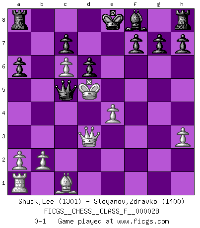 Last move : 0-1 2007 April 7 1:46:19 [Event "FICGS__CHESS__CLASS_F__000028"] [Site "FICGS"] [Date "2007.02.23"] [Round "1"] [White "Shuck,Lee"] [Black "Stoyanov,Zdravko"] [Result "0-1"] [WhiteElo "1301"] [BlackElo "1400"] 1.e4 e5 2.Nf3 d6 3.d4 Bg4 4.c3 Qf6 5.h3 Bxf3 6.gxf3 exd4 7.cxd4 Nc6 8.Bb5 Nge7 9.d5 a6 10.Bxc6+ bxc6 11.Nc3 Qe5 12.Rg1 Qh2 13.Rg3 Ng6 14.Ne2 Nh4 15.Nf4 Qh1+ 16.Kd2 Qh2 17.Kd3 Qxf2 18.Qe2 Qxg3 19.dxc6 Nxf3 20.Kc4 Ne5+ 21.Kd5 Qg1 22.Nd3 Nxd3 23.Qxd3 Qc5+ 0-1 Philidor's defense Player Black won this chess game. Follow this game move after move (download)The only thing Chess players have in common is Chess. (Lodewijk Prins) Garry Kasparov war erst in der Großmeister-Organisation GMA, dann in der Profischach-Vereinigung PCA, zum Schluss kehrte er wieder in den Schoß der FIDE zurück. Aber gut, manche Leute sind flexibel (Viswanathan Anand) Muchos jugadores de Ajedrez se sorprendían cuando después de la partida, Fischer explicaba con calma: 'Yo ya había analizado esta posibilidad' en una posición en la cual yo creía que no era posible de prever desde la apertura. (Mikhail Tal) Soyez une menace à chaque fois que vous vous asseyez pour jouer. (Ken Smith) It is not enough to be a good player... you must also play well. (Siegbert Tarrasch)