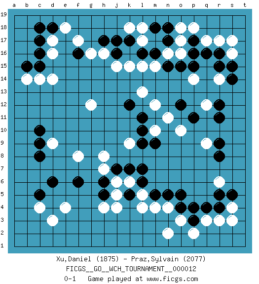 Last move : 0-1 2015 January 3 0:42:31 [Event "FICGS__GO__WCH_TOURNAMENT__000012"] [Site "FICGS"] [Date "2014.11.01"] [Round "1"] [Black "Xu,Daniel"] [White "Praz,Sylvain"] [Result "0-1"] [Rating 1 "1875"] [Rating 2 "2077"] 1.q16 d16 2.q4 d3 3.k17 r14 4.r12 r17 5.r16 q17 6.p16 s16 7.s15 s17 8.r15 o17 9.n15 r6 10.r8 o3 11.o4 n4 12.o5 r3 13.r4 q3 14.p3 p2 15.p4 n2 16.n5 m4 17.m5 l5 18.l6 k6 19.k5 l4 20.k7 j6 21.l7 h8 22.c5 e4 23.c8 c4 24.c10 k9 25.m9 q12 26.r11 m12 27.l11 l13 28.k12 k15 29.j7 h7 30.h6 j5 31.h5 j4 32.f6 f8 33.d6 g12 34.f16 h16 35.h17 d14 36.c17 d17 37.d18 e18 38.c18 f17 39.b15 g16 40.j16 j15 41.p17 p18 42.n18 o18 43.n17 o16 44.o15 n16 45.m16 m15 46.l16 p14 47.s14 m10 48.l9 o10 49.l10 q9 50.r9 s4 51.s5 s3 52.r5 d9 53.c9 b14 54.c15 c14 55.c16 h4 56.p15 l15 57.o12 n11 58.p11 l18 59.m18 k18 60.j17 l17 0-1 Here are the names of the openings (joseki) played in the four corners : Corner q16 : q16 r14 Hoshi (Hwajeom, Seongjeom, Xingwei`) 4-4 Point. The star or hoshi (4-4) point, emphasizing influence at the potential expense of territory. Ikken Kakari (Hankan Keolch'im, Yi Gua`jiao~, 1-Space Low Approach). White 2 is the standard approach move to the 4-4. Corner q4 : q4 r6 Hoshi (Hwajeom, Seongjeom, Xingwei`) 4-4 Point. The star or hoshi (4-4) point, emphasizing influence at the potential expense of territory. Ikken Kakari (Hankan Keolch'im, Yi Gua`jiao~, 1-Space Low Approach). White 2 is the standard approach move to the 4-4. Player White won this Go (weiqi, baduk) game. Follow this game move after move (download)There is death in the hane. (Anonymous) It's not enough to succeed. Others must fail. (Gore Vidal)